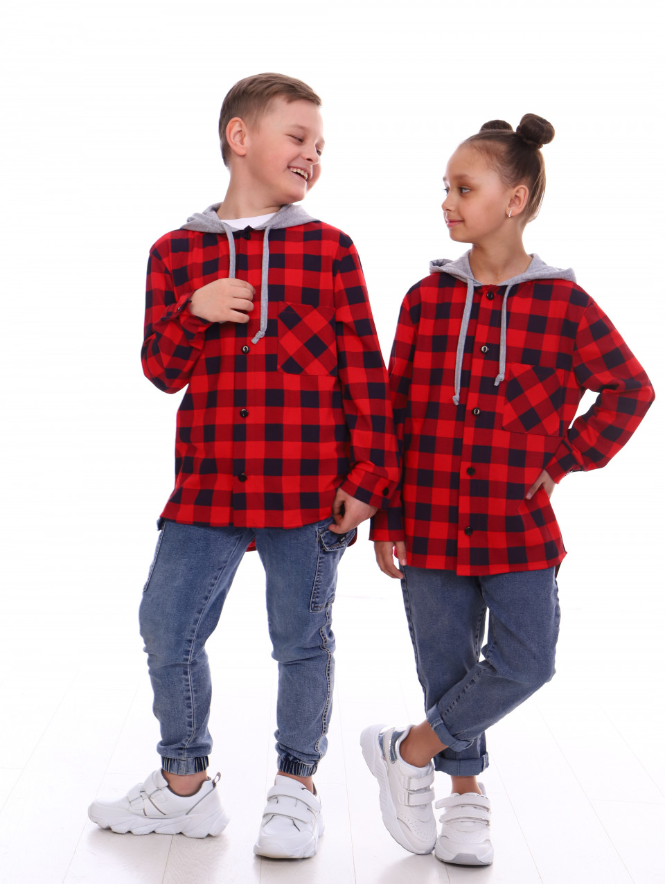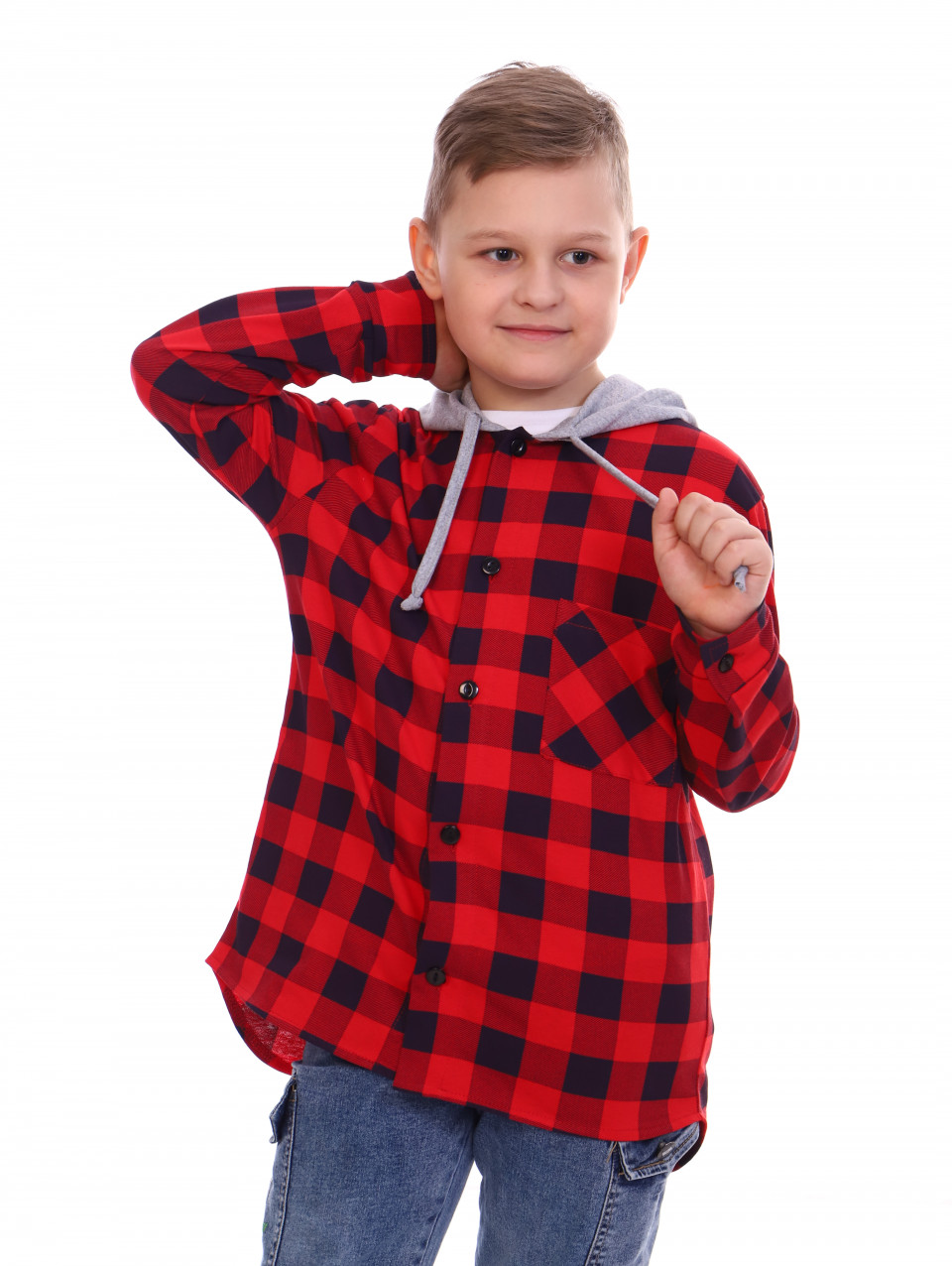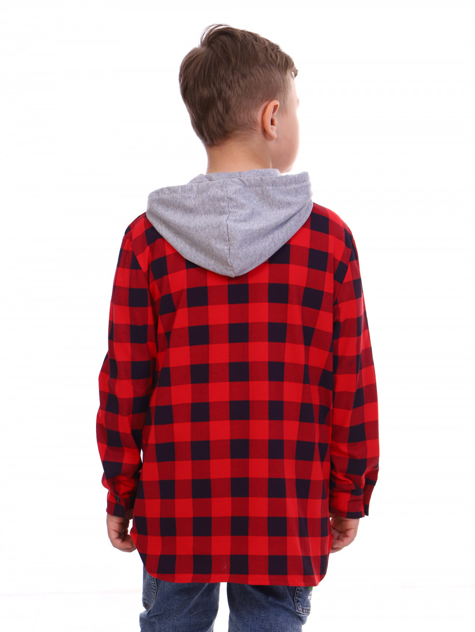 Детская рубашка с капюшоном в клетку выполнена из 100% хлопка. Кофта свободная, слегка оверсайз. Трендовая рубашка для мальчика на полочке с кармашком и c застёжкой на пуговицы. Капюшон с завязками. Рубашка с длинным рукавом прекрасно сочетается с однотонной футболкой, джинсами, брюками, кроссовками.