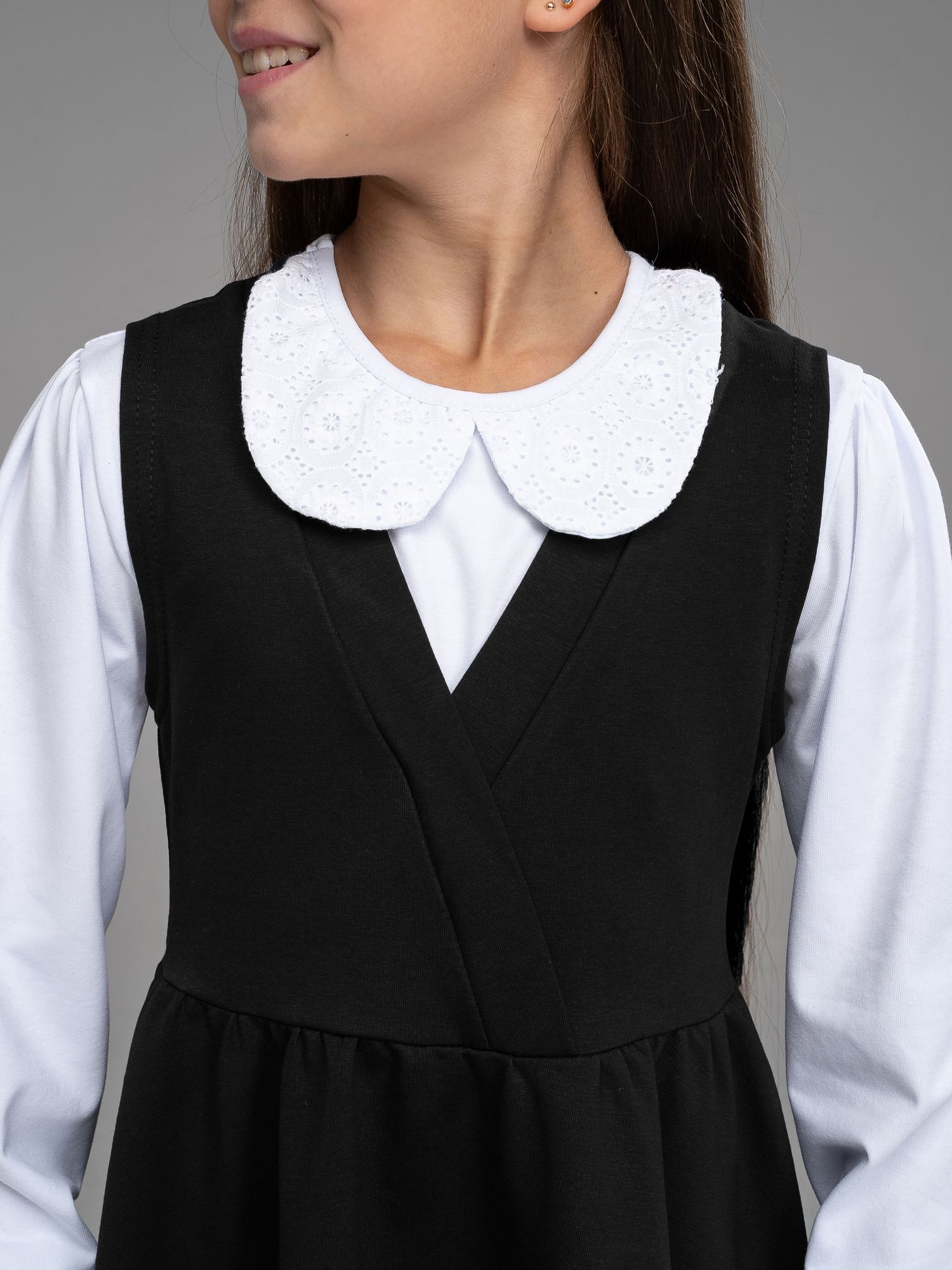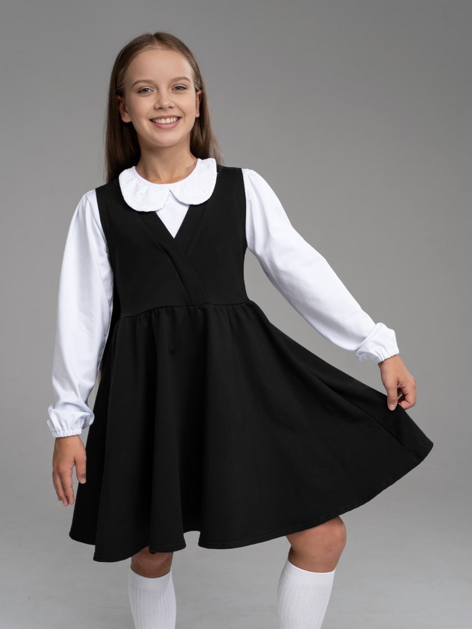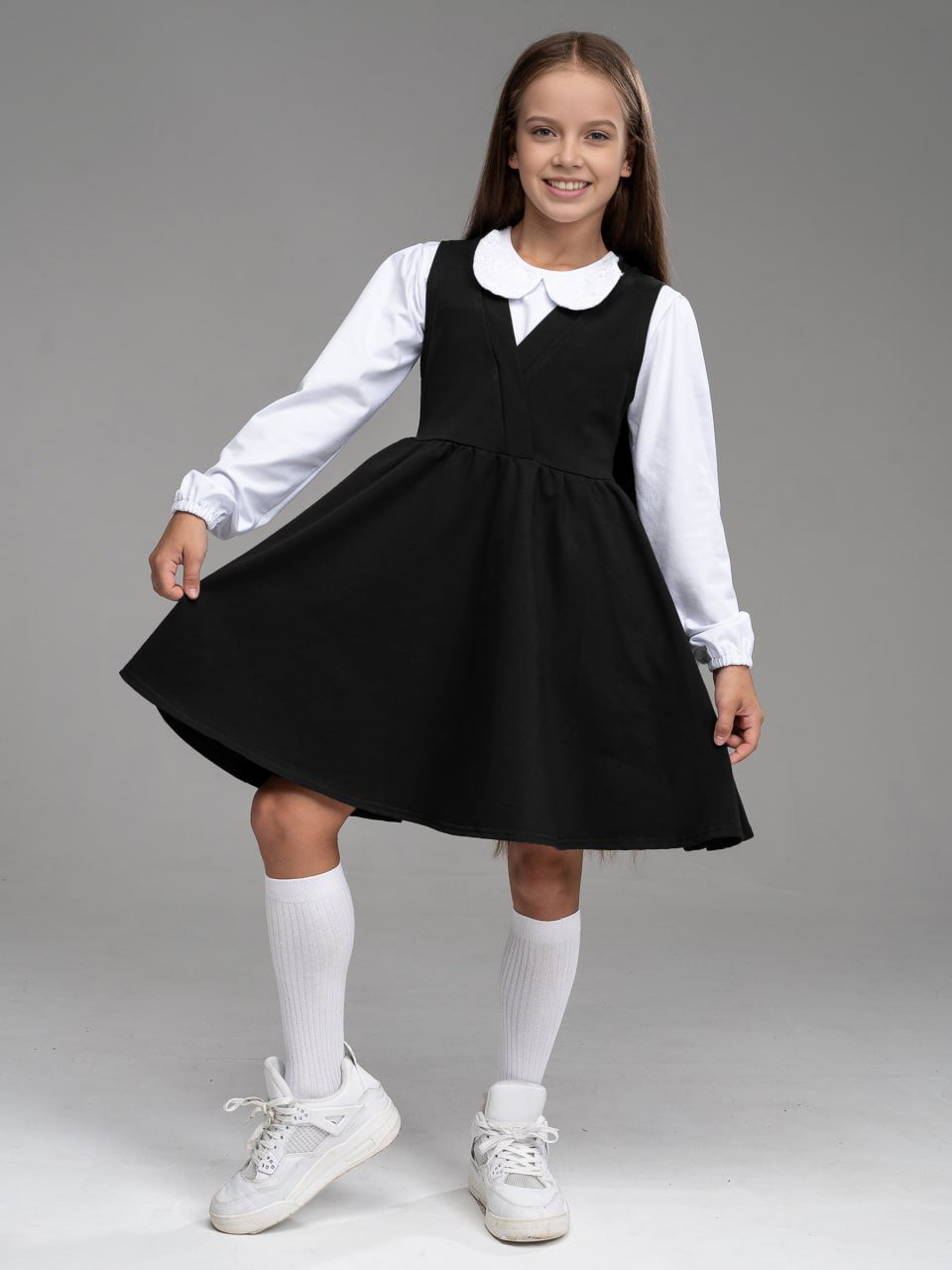Стильный школьный сарафан из футера черного цвета для девочки, отрезной по линии талии. Юбка расклешенная, со сборками, лиф с имитацией запаха. Изделие выполнено из трикотажа премиального качества - ПЕНЬЕ, с содержанием хлопка более 92%