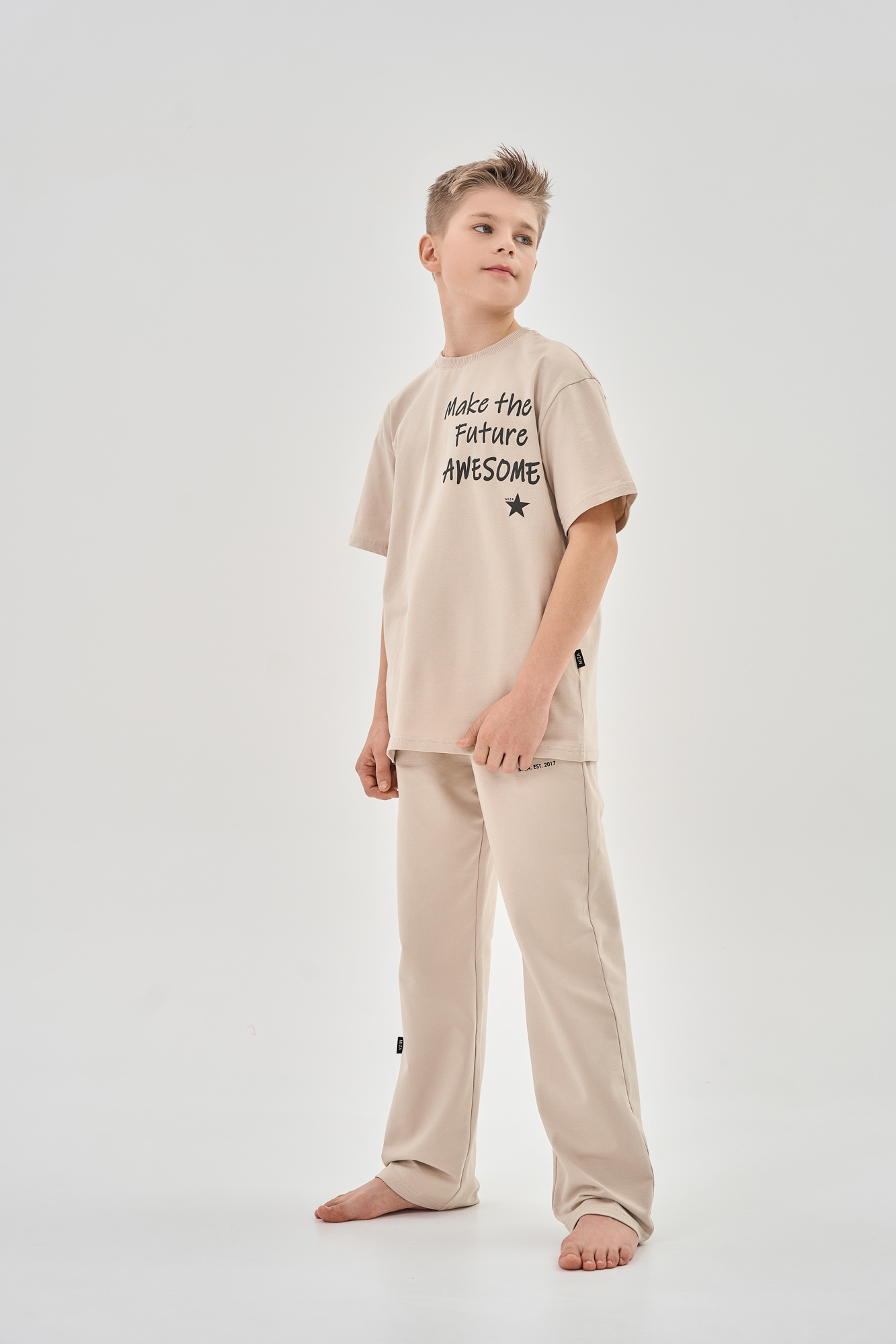 Комплект состоит из футболки свободного кроя, дополненной дизайнерскими принтами в объемной технике, и брюк прямого кроя.