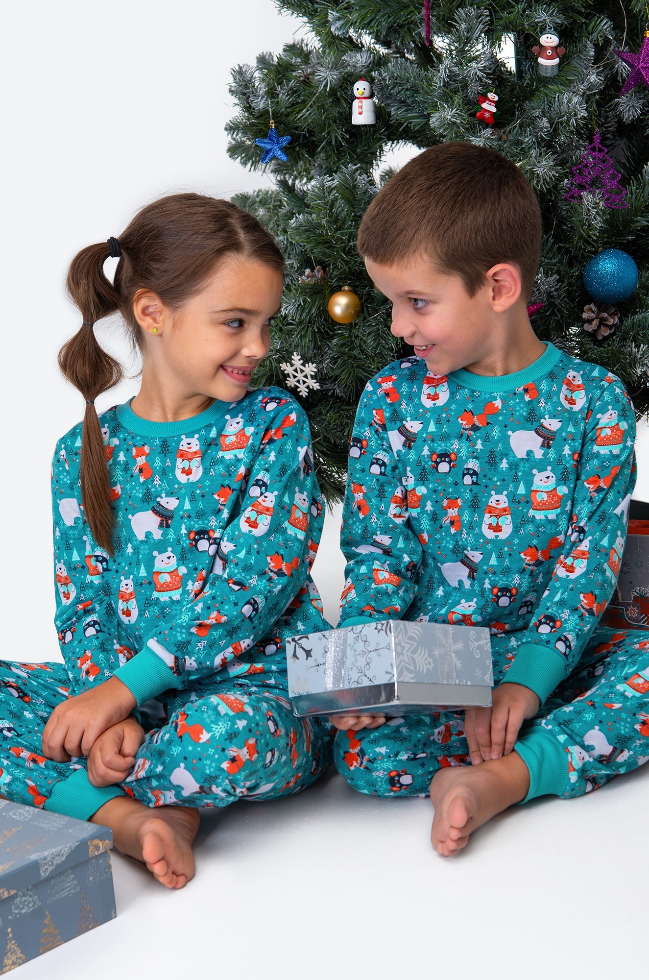 ..показатьДетская пижама с брюками выполнена из натурального 100% хлопка. Свободный крой не сковывает движений и позволяет ребенку всегда оставаться активным, а яркий бирюзовый цвет и праздничный принт создают уютную атмосферу и поднимают настроение. Пижамка для мальчиков и девочек станет отличным подарком на Новый год и Рождество.