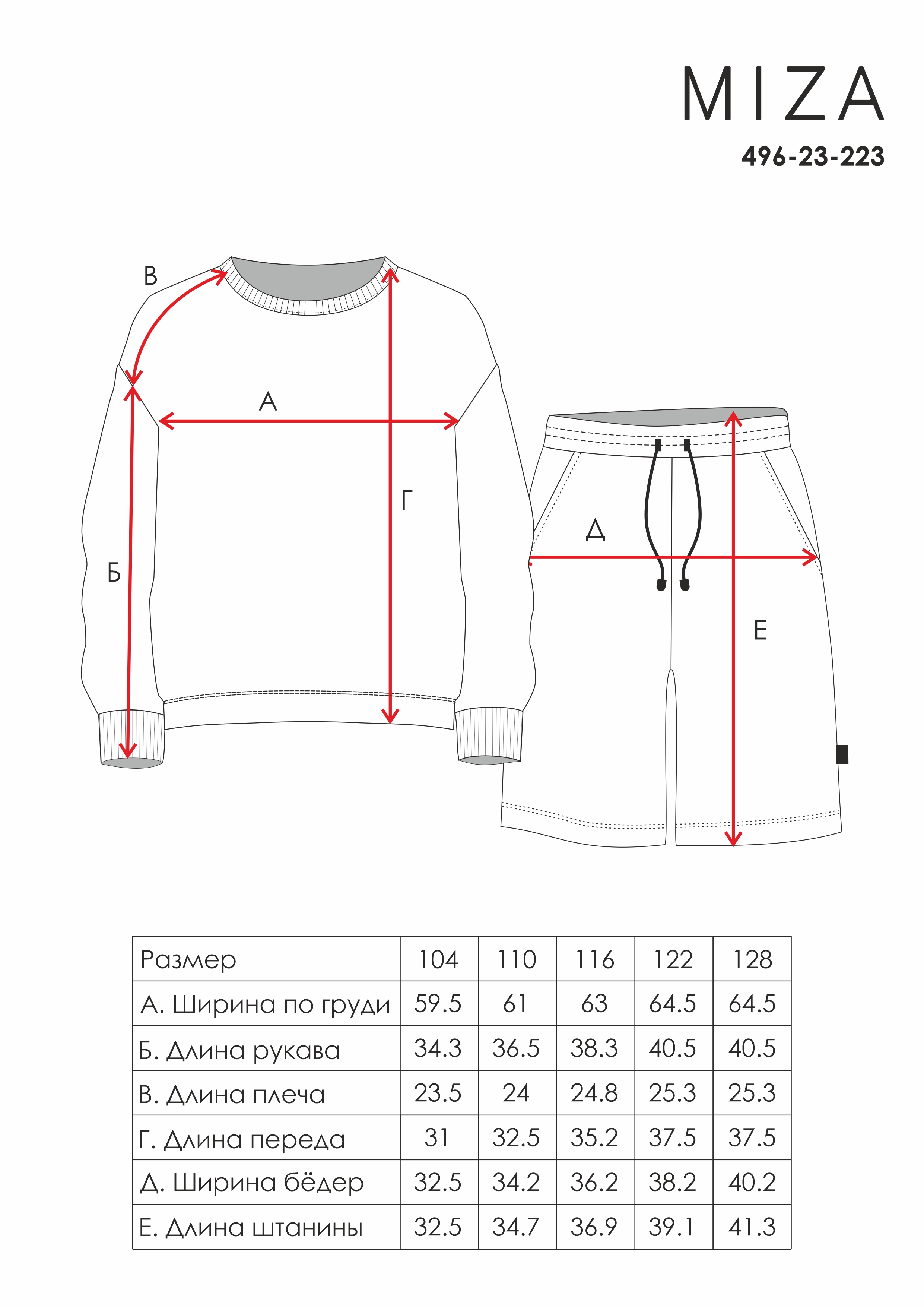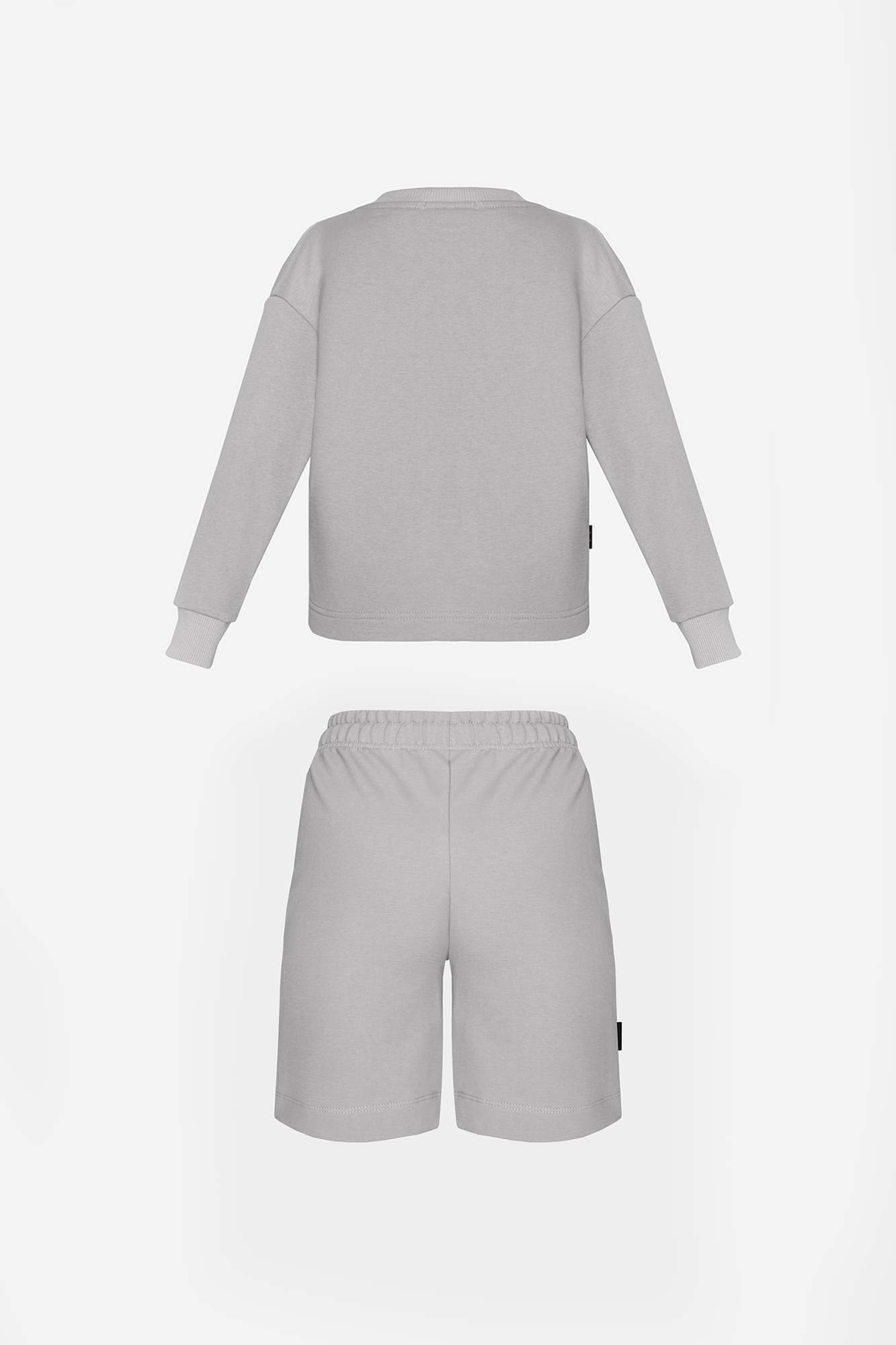 Состоит из свободного свитшота с имитацией необработанного края и прямых широких шорт на мягком эластичном поясе со шнурком.