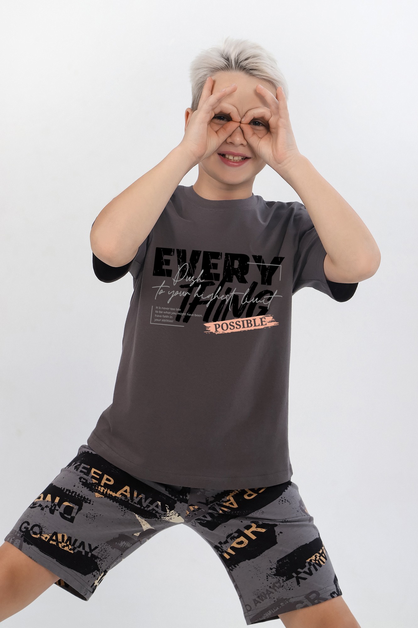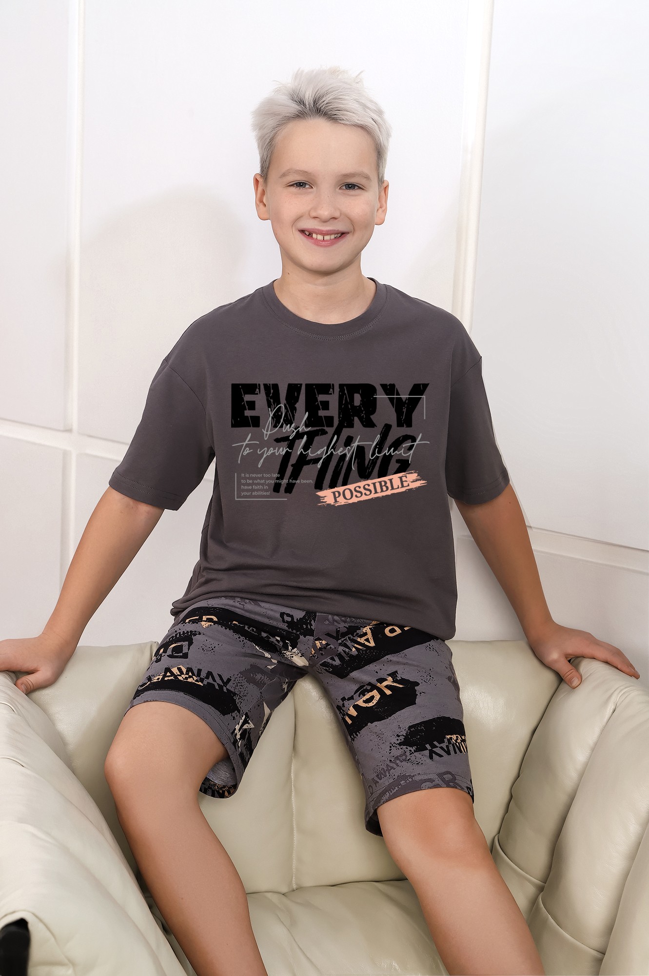 Костюм для мальчика ,состоящий из футболки и шорт. Футболка - из гладкокрашеного полотна "кулирка", классического покроя, с короткими втачными рукавами, горловиной овальной формы, обработанной втачной планкой, и принтом вцентре переда, выполненным в технике шелкографии. Шорты - из полотна с набивным рисунком, удлиненные, на притачном поясе с эластичнойтесьмой внутри и карманами в боковых швах, входы в которые окантованы основным материалом.