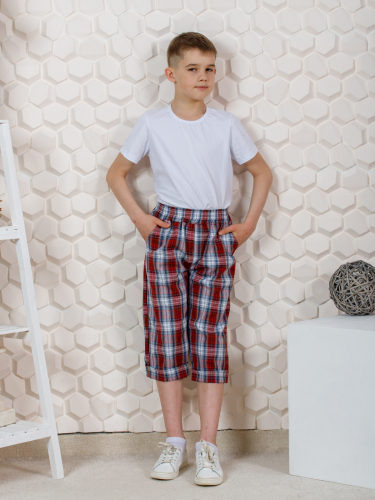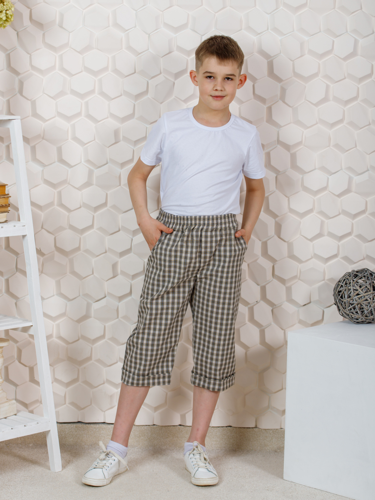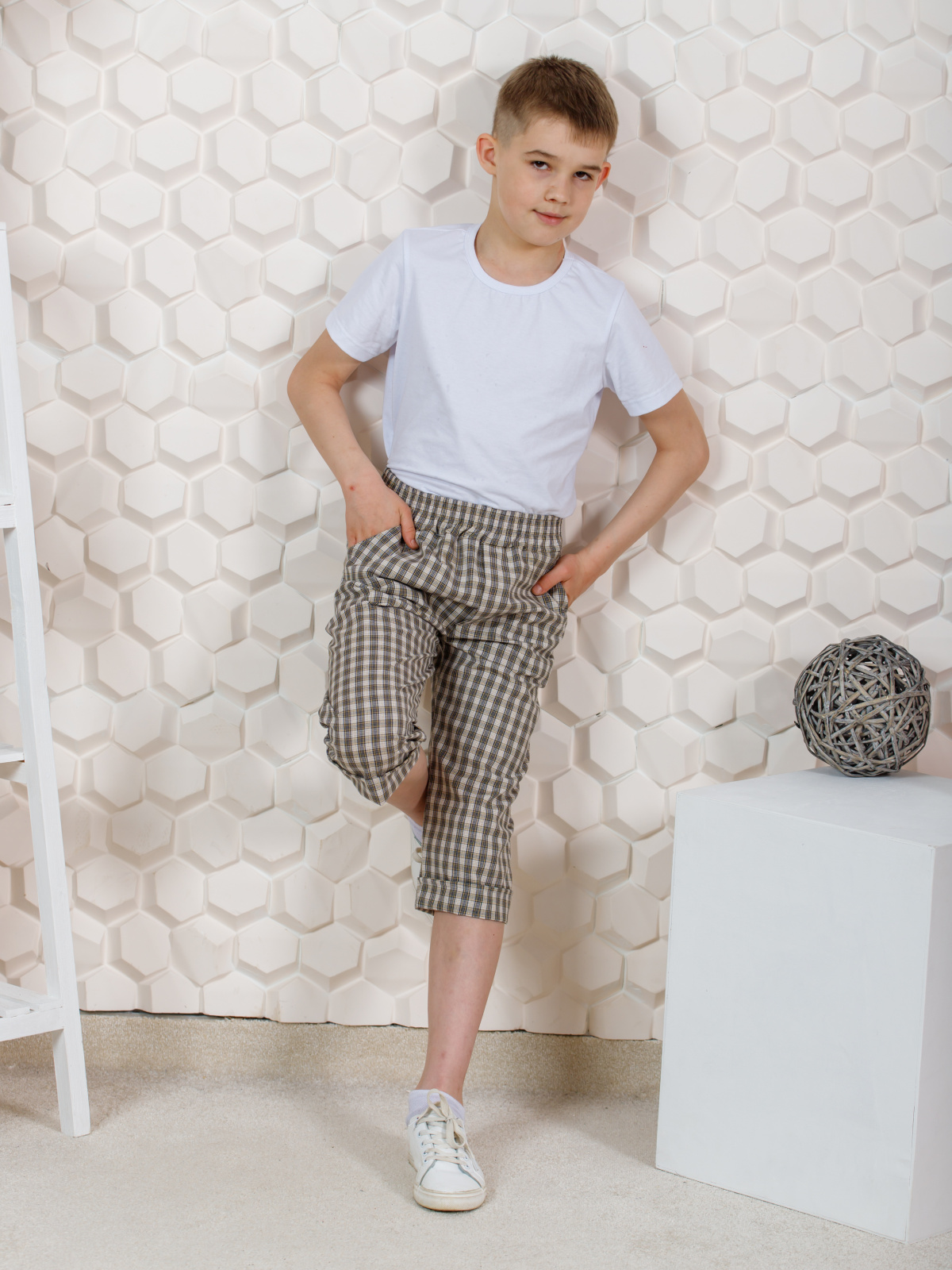 Стильные бриджи на мальчика с рисунком клетка, прямого кроя, с загибом внизу брючин, с поясом на резинке, в боковых швах карманы.