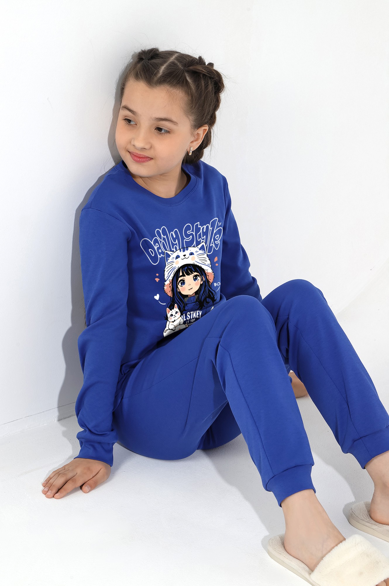 Пижама из интерлока для девочки, состоящая из джемпера и брюк. Джемпер со слегка спущенной линией плеч, с принтом на переде. Низ рукавов и брючек на манжетах.