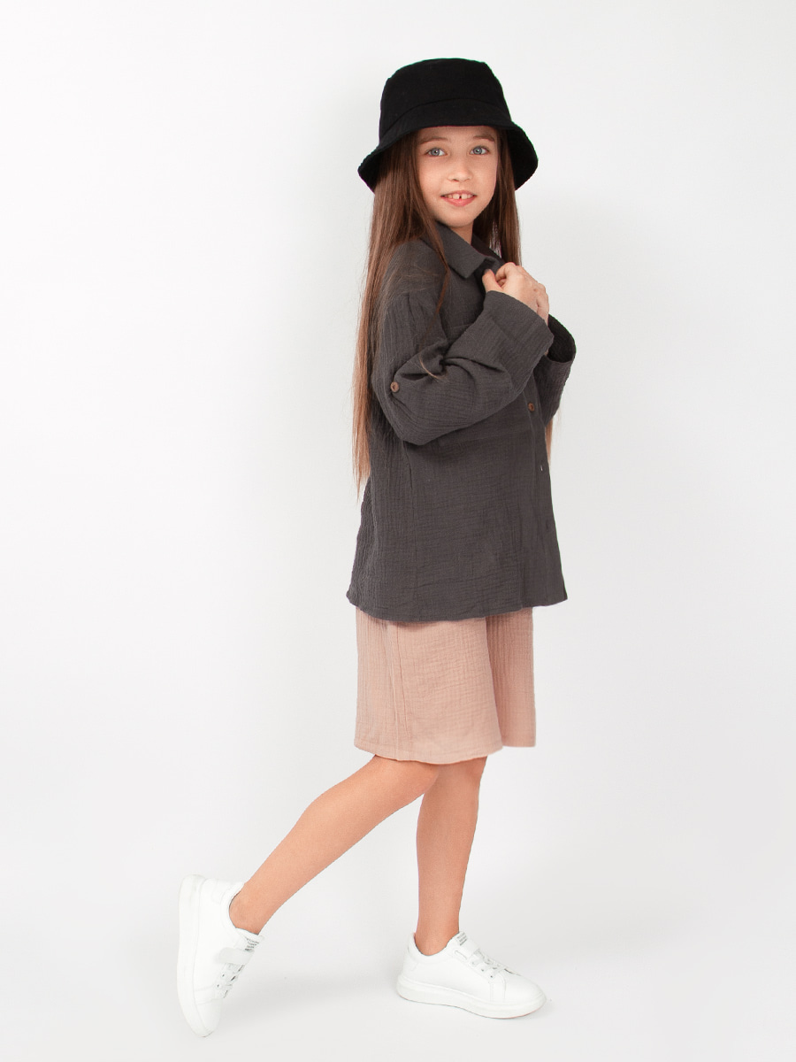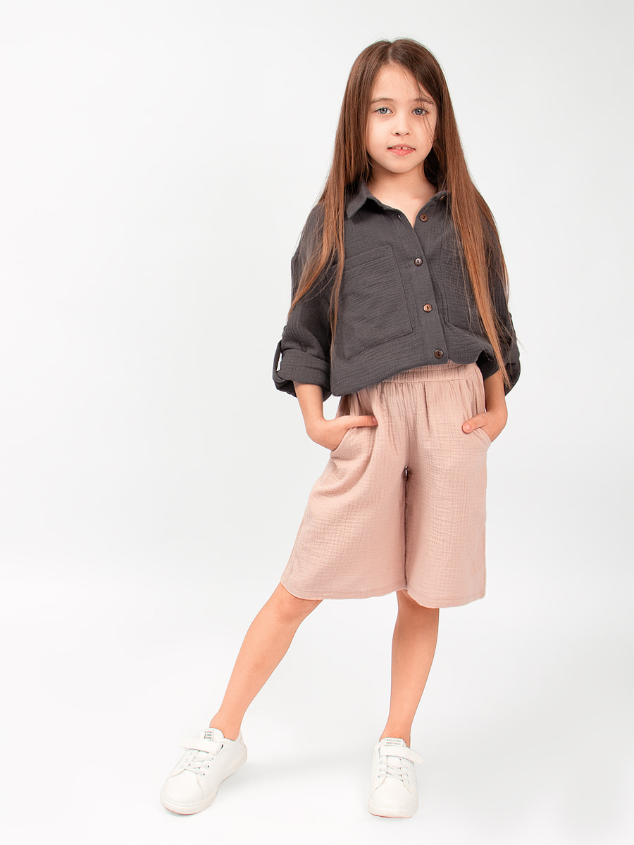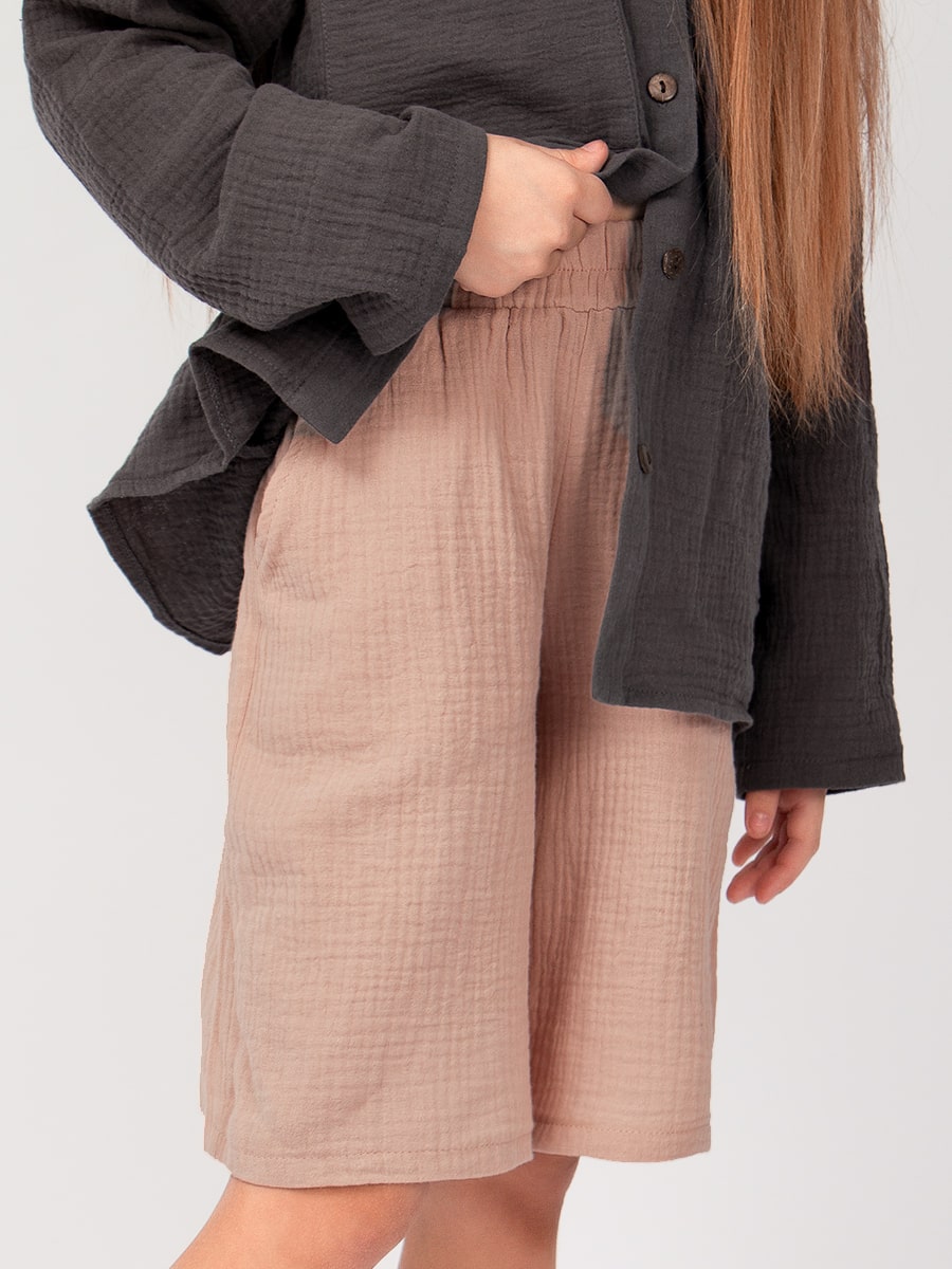 Шорты детские Соль&Перец из муслина. Ткань-двухслойный муслин, хорошо пропускает воздух, защищает от солнца, идеально подходит для чувствительной кожи. Модель шорт свободная, не сковывающая движений и немного удлиненная. Шорты из муслина имеют мягкую резиночку на поясе, по бокам карманы. Отличный вариант для летних прогулок, похода на пляж, отдыха на природе.