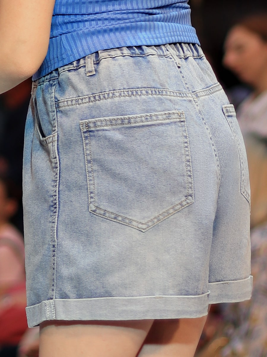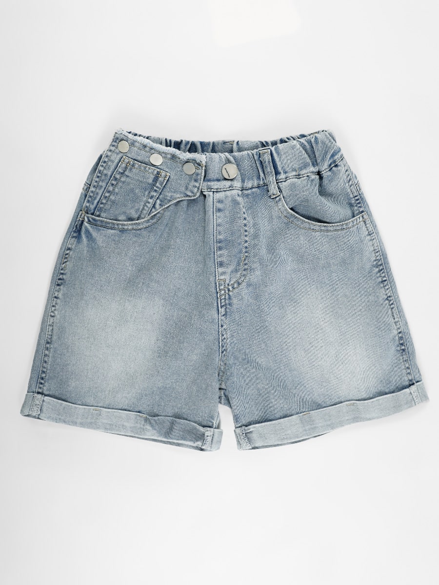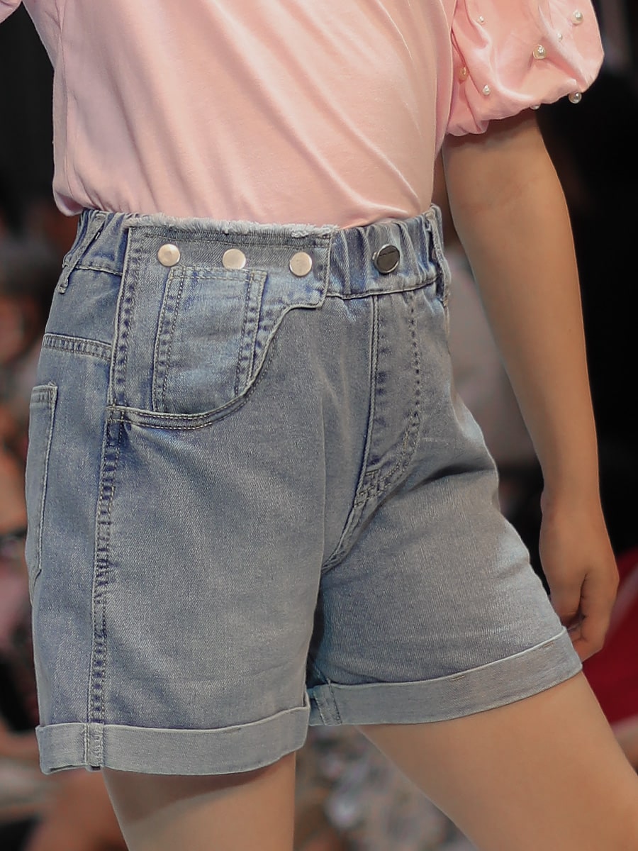 Джинсовые шорты с отворотами незаменимая вещь в гардеробе каждой девочки. Они легко комбинируются с любой майкой или футболкой. Пояс на широкой, эластичной резинке, без молнии и пуговиц. Модель особенно актуальна на прогулке, на пляже, в бассейне или в путешествии. Ремень в комплект не входит.