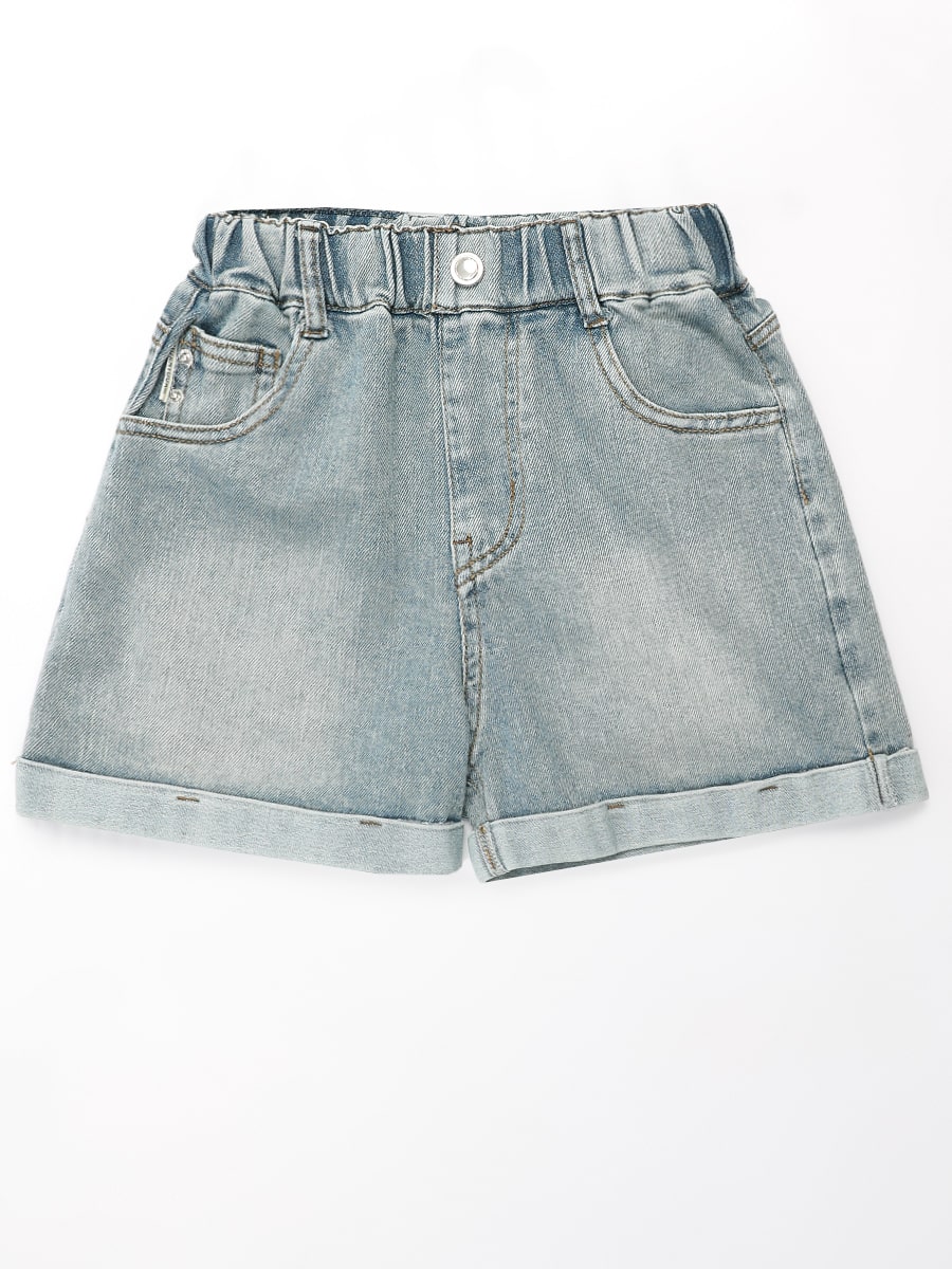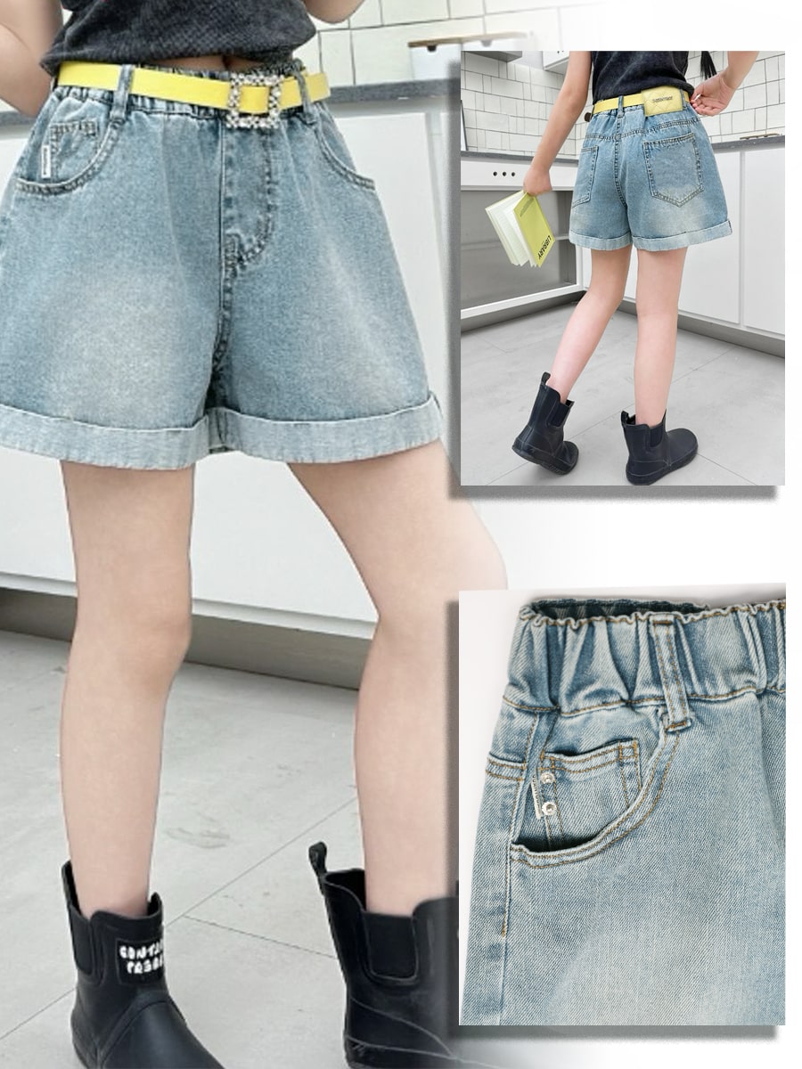 Джинсовые шорты с отворотами незаменимая вещь в гардеробе каждой девочки. Они легко комбинируются с любой майкой или футболкой. Пояс на широкой, эластичной резинке, без молнии и пуговиц. Модель особенно актуальна на прогулке, на пляже, в бассейне или в путешествии. Ремень в комплект не входит.