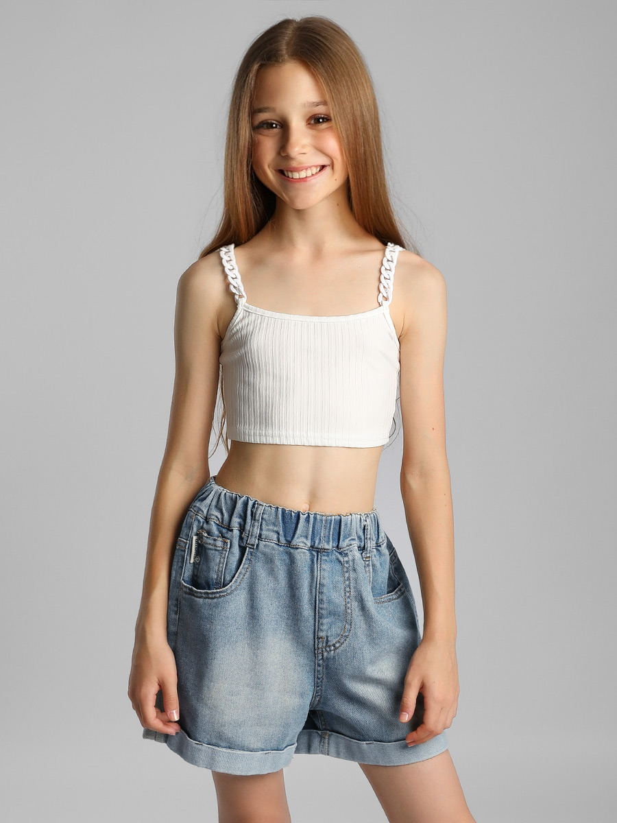 Джинсовые шорты с отворотами незаменимая вещь в гардеробе каждой девочки. Они легко комбинируются с любой майкой или футболкой. Пояс на широкой, эластичной резинке, без молнии и пуговиц. Модель особенно актуальна на прогулке, на пляже, в бассейне или в путешествии. Ремень в комплект не входит.