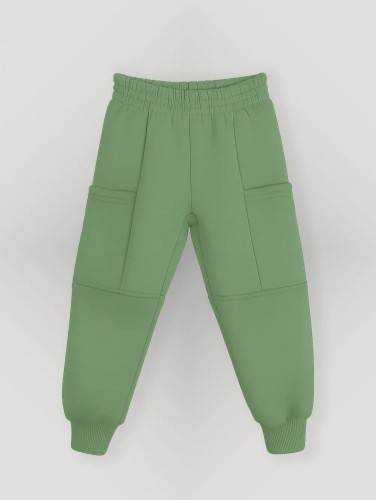 Особенность модели — объёмные накладные карманы по бокам, которые делают брюки более функциональными и добавляют современный, слегка «карго» стиль. Широкий эластичный пояс обеспечивает удобную посадку, а манжеты по низу фиксируют штанину.