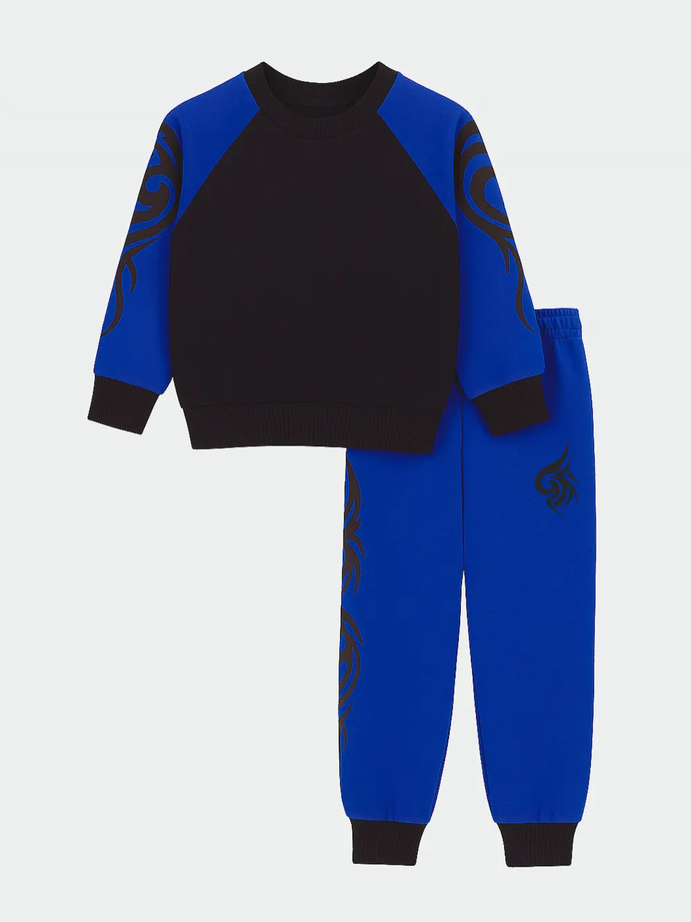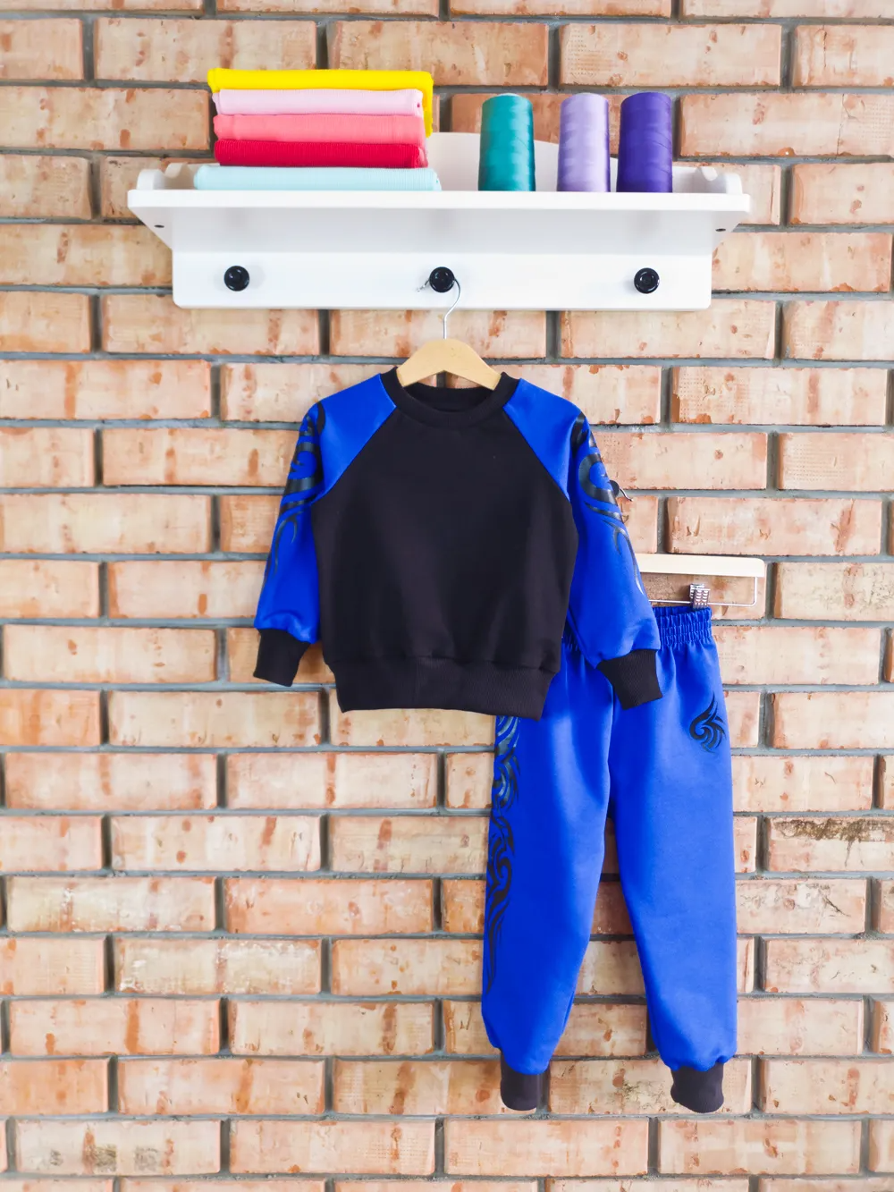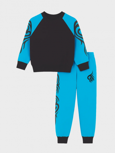 Костюм выполнен из прочного и эластичного футера двухнитки с лайкрой — ткань приятно ощущается на теле, отлично тянется и надёжно сохраняет форму. Яркий термопринт добавляет эффектный акцент и делает комплект ещё более стильным.