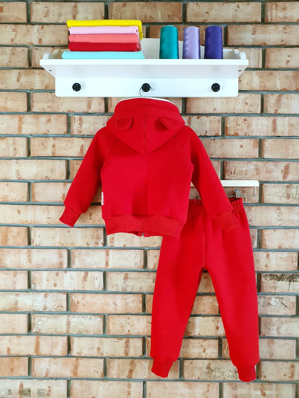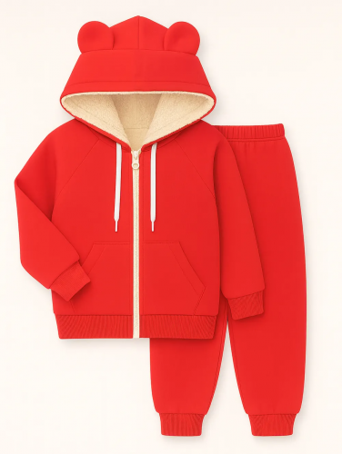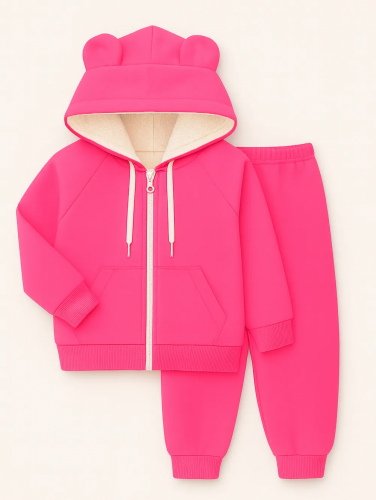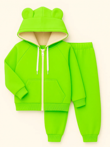 Костюм выполнен из тёплого, мягкого футера с начёсом — идеальный вариант для прохладной погоды, прогулок и активных игр на свежем воздухе.