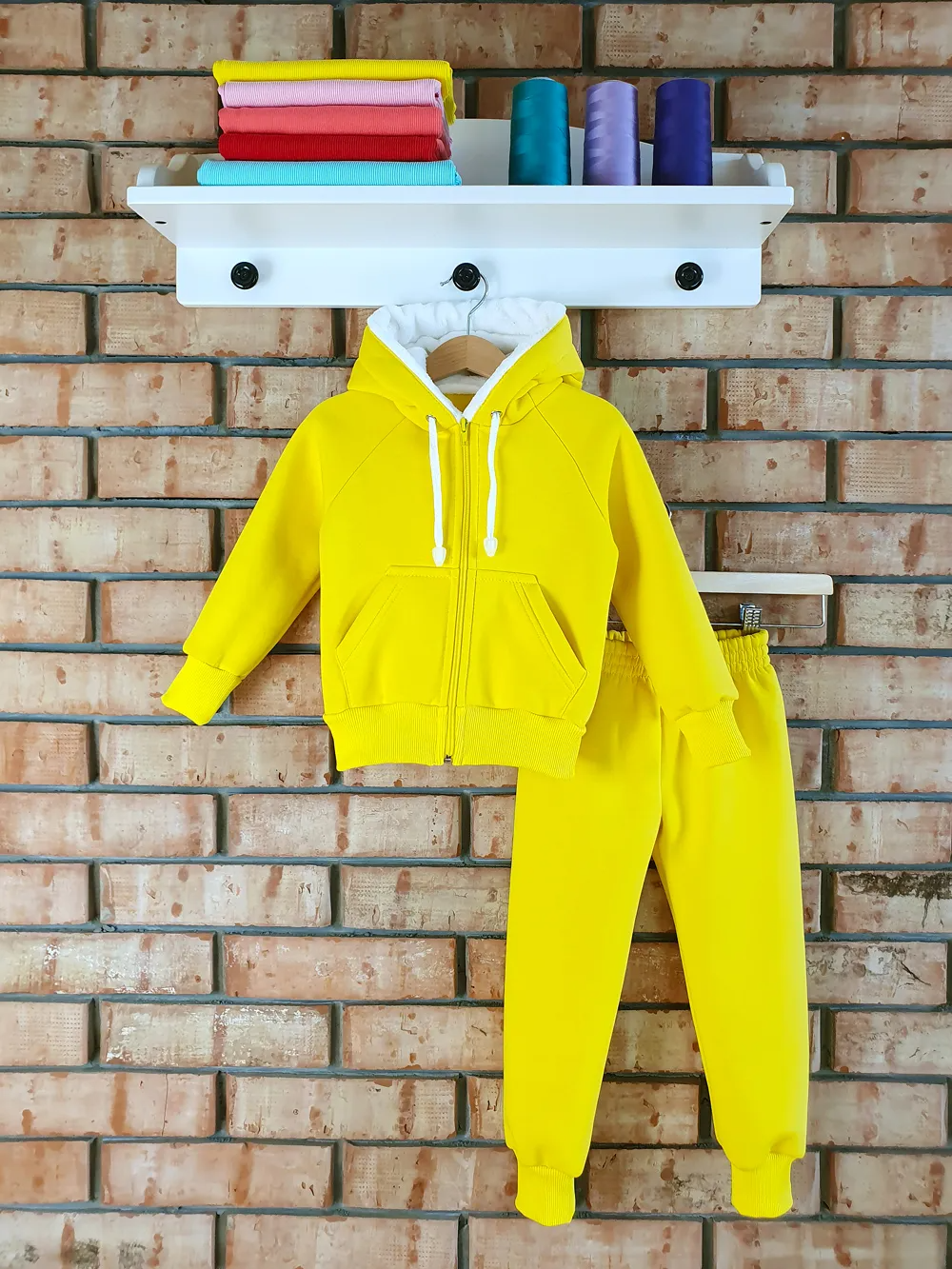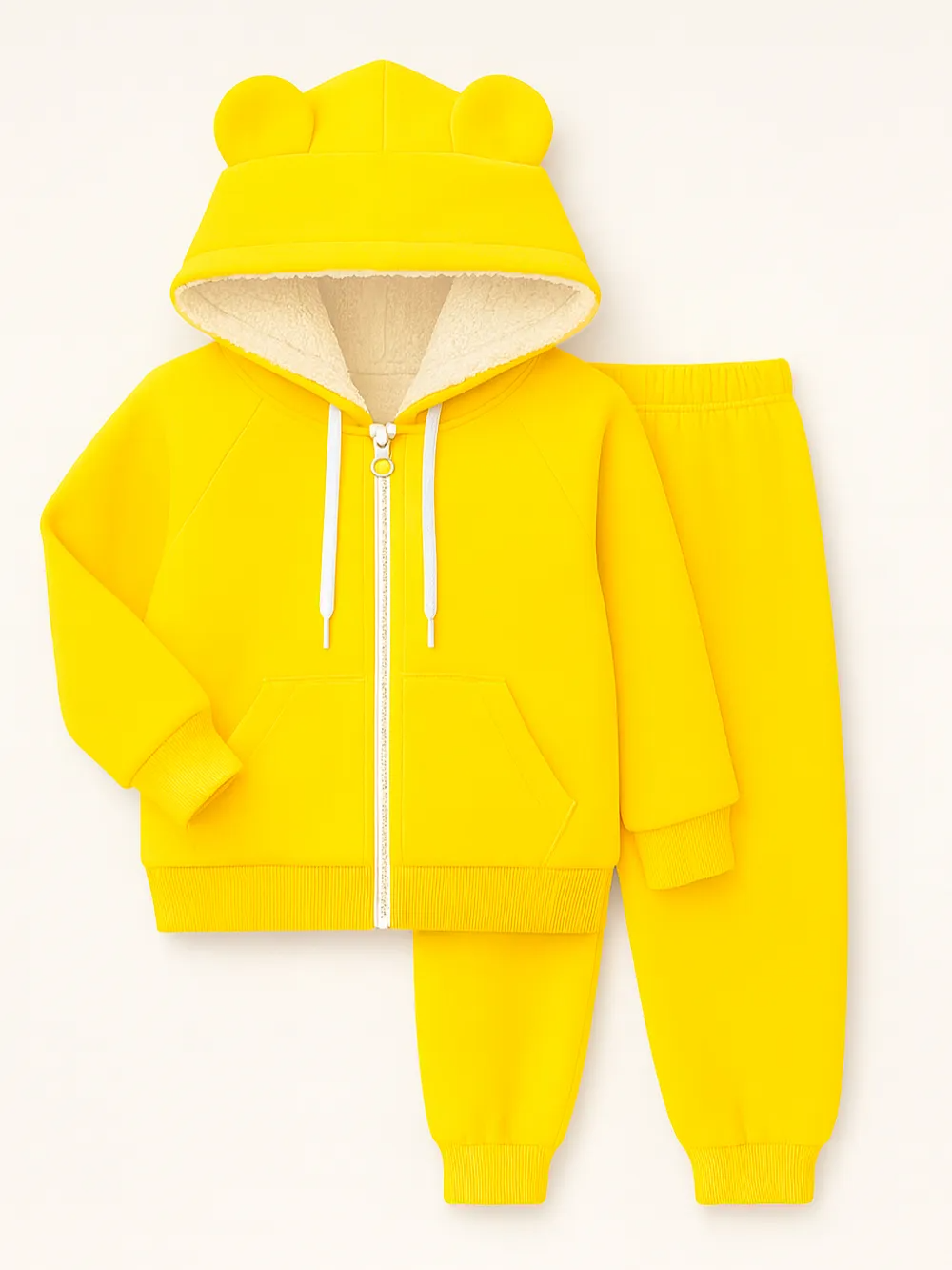 Костюм выполнен из тёплого, мягкого футера с начёсом — идеальный вариант для прохладной погоды, прогулок и активных игр на свежем воздухе.