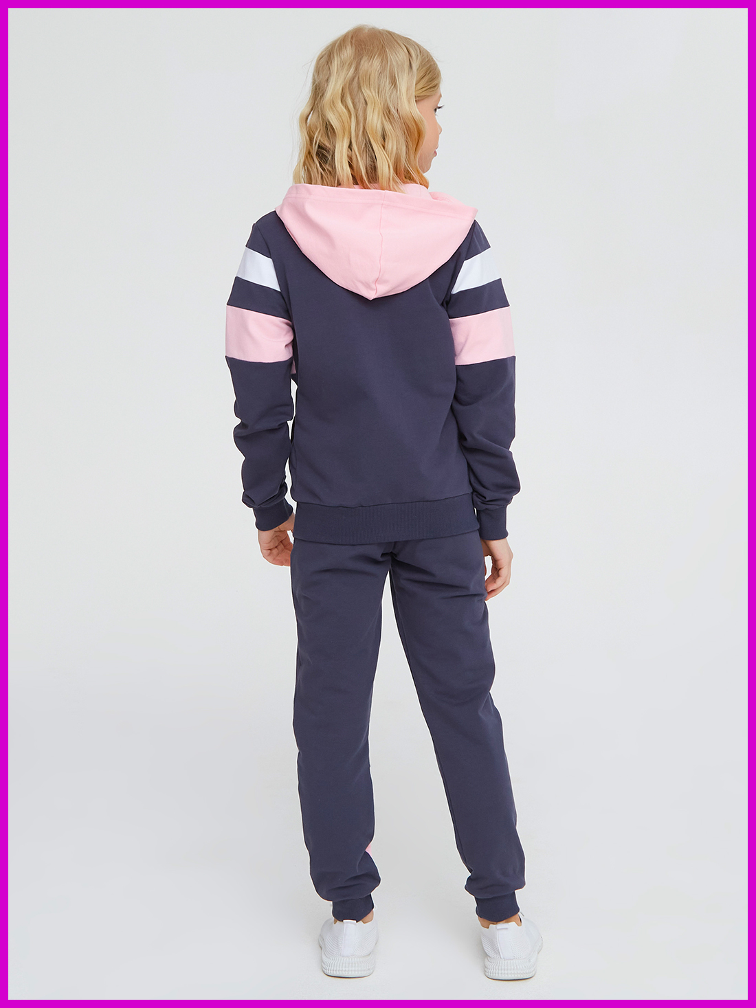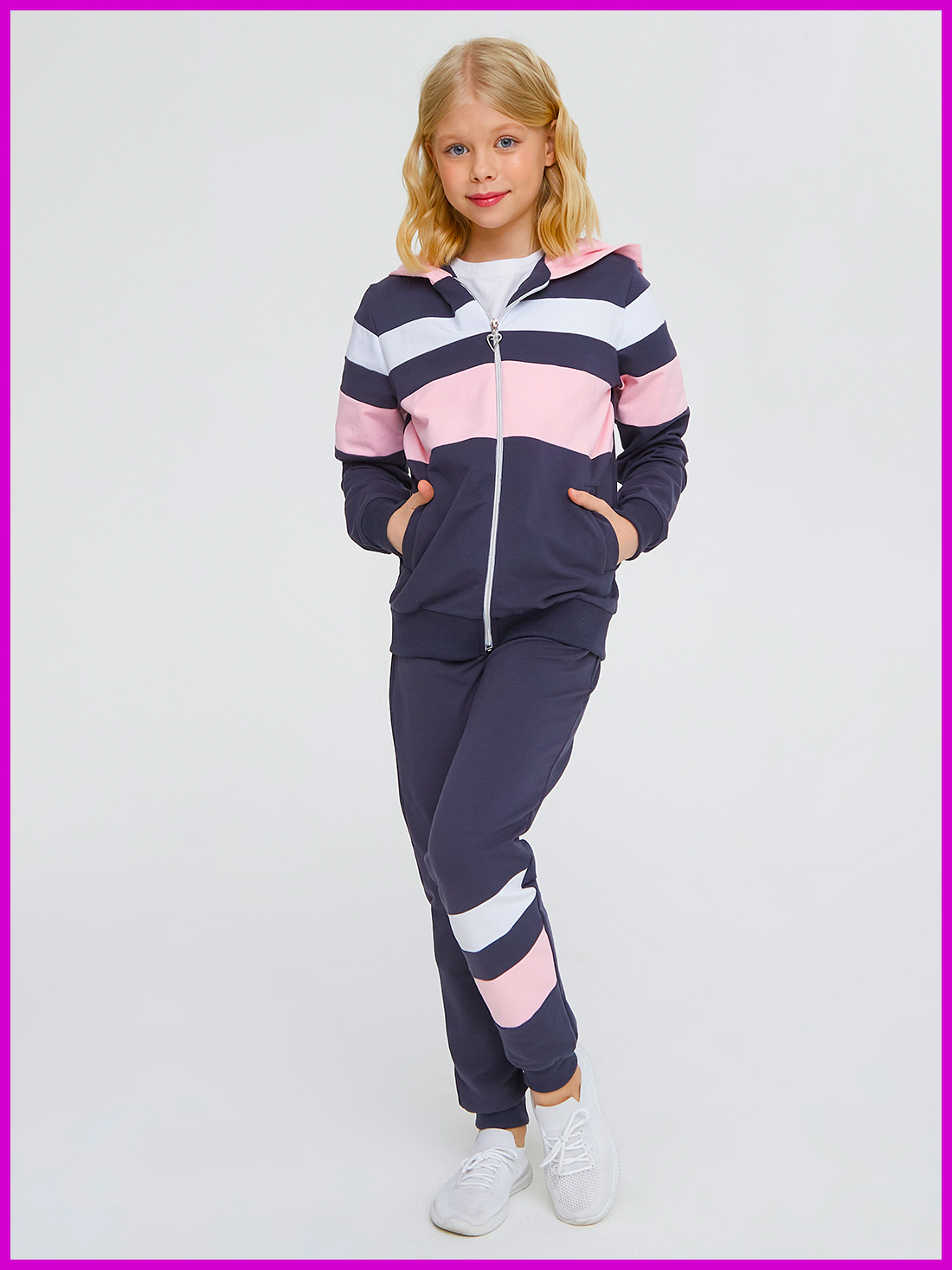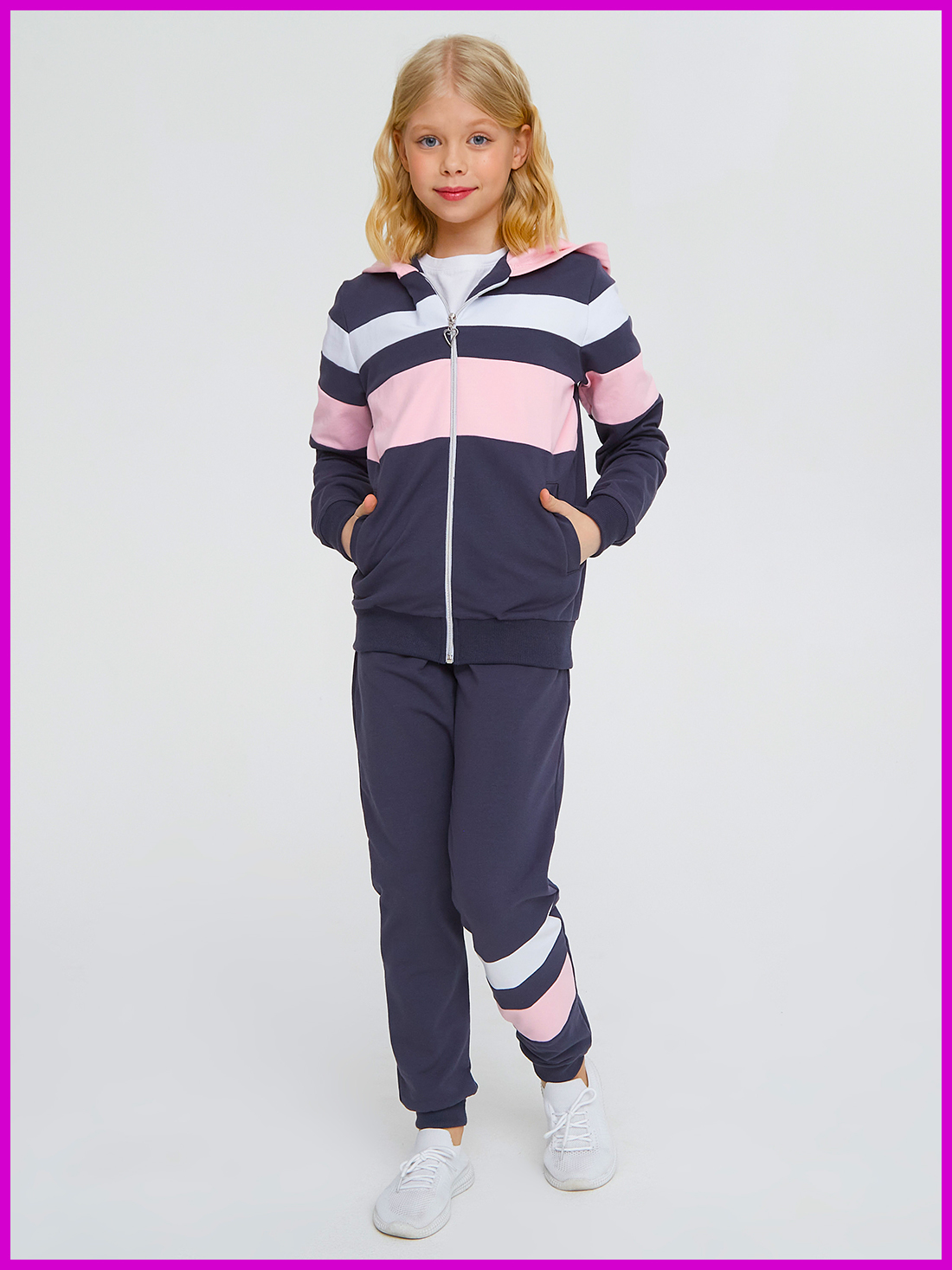 Спортивный костюм выполнен из высококачественного трикотажного полотна.Костюм состоит из куртки с длинным рукавом и брюк на манжете.На полочке олимпийка декорирована вставками из контрасных тканей.
