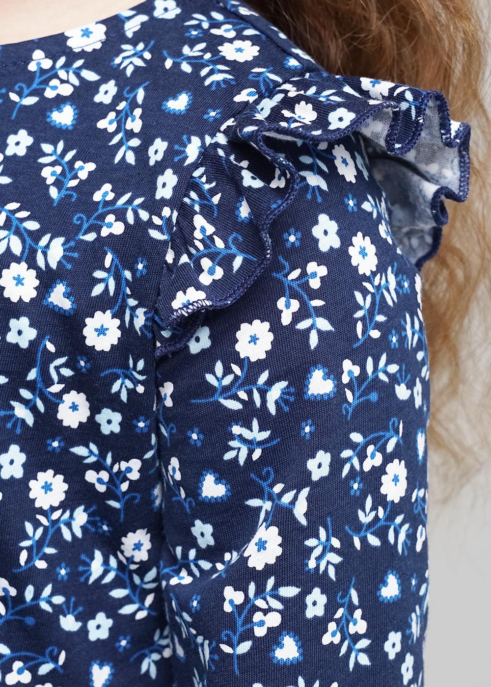 Ярусное платье в романтичном стиле из набивного хлопкового трикотажа. А-силуэт, на плечах оборки, объемный рукав со сборкой по низу.