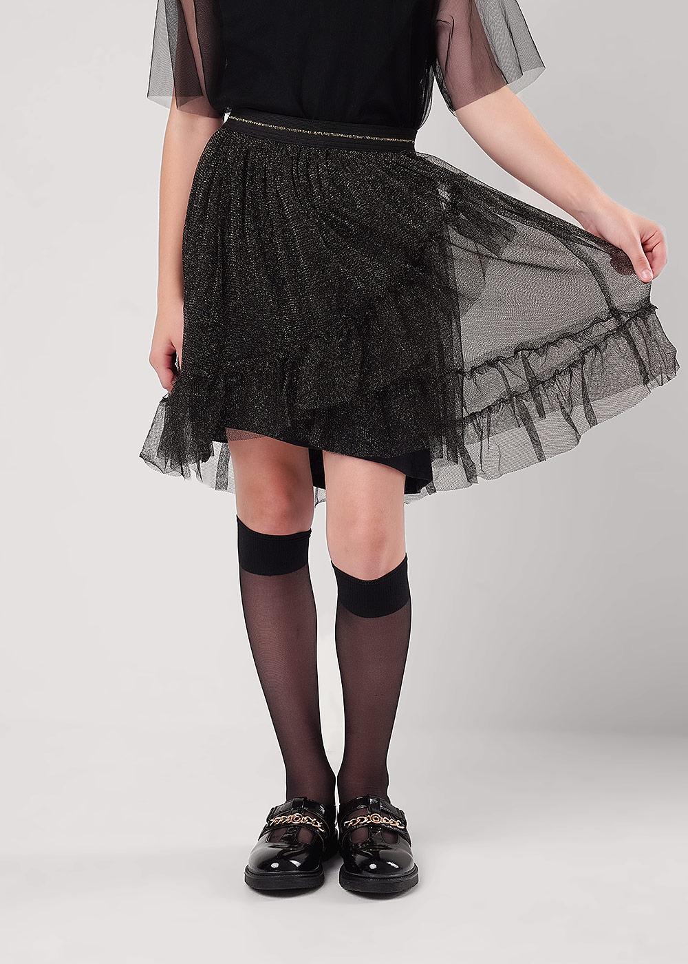 Эффектная сетчатая юбка с хлопковым подкладом. Впереди имитация запаха. По низу изделия пышный волан. На талии тесьмой с золотой полоской