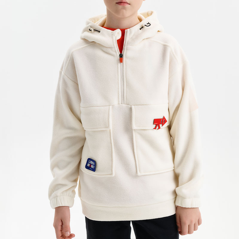 Состав: 100%полиэстерОписание: Толстовка флисовая для мальчика со спущенным плеччом из 100% полиэстера. Для удобства надевания в верхней части переда застежка на молнию. По переду большие накладные карманы с клапанами. На спинке кокетка из флиса, переходящая на перед. Низ рукава присборен на внутренний эластик. По низу изделия притачной пояс. Капюшон двухшовный со стойкой по переду и люверсами, высота капюшона регулируется с помощью эластик -корд. Внутренняя обтачка капюшона выполнена из флиса. Перевод текста на капюшоне: чтобы согреться. Перевод текста на кармане: деньги на обед.