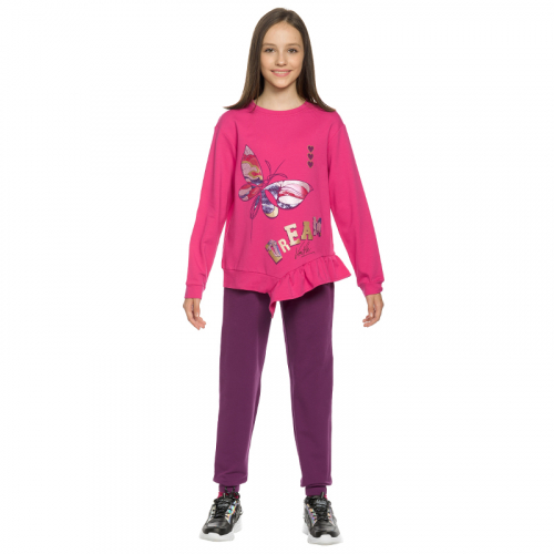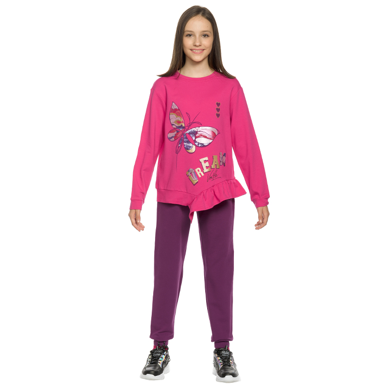 Состав: верх: 96%хлопок 4%эластан, низ: 96%хлопок 4%эластанОписание: Комплект из футера для девочек свитшот и брюки. Свитшот расслабленного силуэта. Rubber принт с золотым металликом и глиттером. Надпись Мечта. Вуаля. По низу изделия декоративный, асимметрично расположенный волан из основной ткани. Брюки на манжете из рибаны увеличенного, актуального объема без защипов. Пояс из основной ткани с эластиком внутри и дополнительной регулировкой объема шнурком.