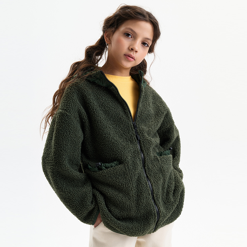 Состав: 100% полиэстер, вставка: 60%нейлон 40%полиэстерОписание: Флисовая куртка детская для девочки. Изделие выполнено в сочетании двух материалов: бербер-флиса с мягкой фактурой «барашка» и гладкой курточной ткани. Это один из наиболее актуальных трендов сезона. Капюшон и отделка вдоль застёжки сделана из курточной ткани. Ребёнок не промокнет, а ткань вдоль молнии не будет мараться при частом использовании. Толстовка детская модного оверсайз-силуэта со спущенным плечом подарит ребёнку комфорт и не будет стеснять его движений. Высокий воротник защищает шею от холода и ветра. По переду застёжка на центральную молнию с крупным пуллером — ребёнку просто застёгивать и расстёгивать. Тканевый стоппер защищает подбородок от зажима молнией. Низ изделия и низ рукавов окантованы эластичной тесьмой — они не растягиваются и сохраняют форму и отличный внешний вид надолго. Куртка с двойными накладными карманами: верхняя часть из основной ткани, внутренняя — из курточной — оригинально и стильно. Объём капюшона и объём внутренних карманов регулируется при помощи эластичной тесьмы со стопперами. Капюшон двухшовный, что обеспечивает анатомически правильную форму и комфортную посадку по голове. Оверсайз-куртка из тедди-флиса однотонная, без принта. За ней просто ухаживать. Оба материала состоят из полиэстера — толстовка тёплая, лёгкая, мягкая, просто стирается и быстро сохнет, не выгорает и не скатывается, сохраняет отличную форму надолго. Куртка выполнена в зелёном цвете (актуальный оттенок хаки). Мягкая куртка идеальна для девочек дошкольного и младшего школьного возраста, а также девочек-подростков. Подходит для детского сада, прогулок, активного отдыха, спорта. Худи с капюшоном можно носить круглогодично: прохладным летом, осенью и весной, зимой. Оно может заменить ветровку в начале осени или конце весны, а зимой послужит тёплым средним слоем одежды. Стильный и практичный подарок дочери, внучке или сестре на любой праздник.