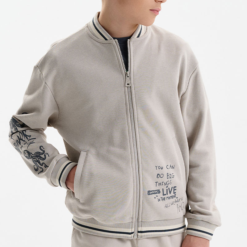 Состав: 84%хлопок 16%полиэстерОписание: Бомбер для мальчика – трикотажная модель свободного кроя. Изделие выполнено из смесовой ткани с высоким содержанием хлопка и небольшим добавлением полиэстера.Бомбер на центральной застежке молнии, со спущенным плечом и углубленной проймой. Воротник, манжеты по рукавам и низу изделия - из декоративного полосатого риба. Боковые карманы с листочками расположены на переде под наклоном. Бомбер декорирован принтом и надписями. Перевод текста на рукавах: никогда не сдавайся: наслаждайся. Перевод на кармане: Ты можешь совершать великие дела. Живи настоящим. Всё, что у нас есть, — это настоящее.