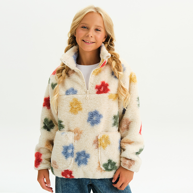 Состав: 100%полиэстерОписание: Куртка для девочки из двустороннего бербер-флиса — мягкого и тёплого материала, который отлично сохраняет тепло и при этом лёгкий и дышащий. Благодаря своей структуре, бербер-флис приятен на ощупь и сохраняет форму даже после многократных стирок. Толстовка застёгивается на молнию в верхней части, что делает её удобной в носке и позволяет регулировать уровень комфорта. По низу изделия и рукавов аккуратная окантовка из эластичной тесьмы обеспечивает хорошую посадку и защищает от продувания. На передней части — практичные накладные карманы, которые отлично подходят для мелочей или для того, чтобы согреть руки. Высокий объёмный воротник с защитным ограничителем не только стильно смотрится, но и надёжно защищает шею от ветра и холода. Особая изюминка — принтованный бербер-флис, который придаёт куртке оригинальный и современный вид. Не забывайте о выборе правильного размера. Используйте таблицу размеров на фотографии, чтобы выбрать подходящий вариант для вашей девочки.