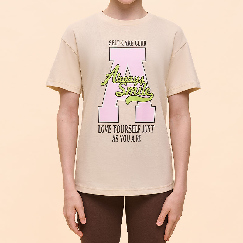 Состав: 100%хлопокОписание: Детская футболка для девочки небольшого объёма прямого кроя. Вырез горловины обработан эластичной рибаной (ткань в рубчик) — она прекрасно держит форму, не растягивается, при этом ребёнку удобно надевать и снимать футболку. Изделие неприхотливо в уходе. Футболка детская с принтом в трендовом университетском стиле по переду. Надписи переводятся: «клуб любви к себе», «люби себя таким, какой ты есть», «улыбайся всегда». Принт эластичный и прочный, без проблем переносит частые стирки. В составе ткани 100% хлопка — майка мягкая, воздухопроницаемая, приятная на ощупь. Футболка для девочек выполнена в универсальном цвете, который хорошо сочетается с различными брюками, шортами. Детские футболки с принтом подходят как для маленьких девочек, так и для девочек-подростков. Хлопковая футболка идеальна для любого времени года, её можно носить как летом, так и в холодное время года в качестве среднего слоя одежды. Помните о правильном уходе за изделием: рекомендуется стирать при температуре не выше 30 °C, без предварительного замачивания, с изнанки. Это поможет сохранить качество и цвет футболки на длительное время. Не забывайте о выборе правильного размера. Используйте таблицу размеров на фотографии, чтобы выбрать подходящий вариант для вашей девочки. Обратите внимание, что цвет товара на экране вашего устройства может отличаться от реального.