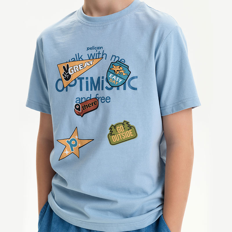 Состав: 100%хлопокОписание: Футболка для мальчика прямого кроя умеренного объема. Уменьшена длина по сравнению с футболками Осень 25. Вырез горловины обработан эластичной рибаной — она прекрасно держит форму, не растягивается, при этом ребёнку удобно надевать и снимать футболку. Футболка с принтом и надписями. Перевод: идём со мной: Оптимистичный и свободный.