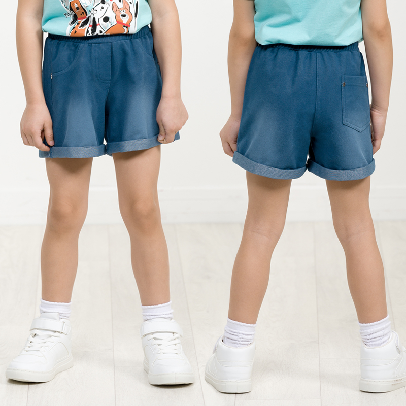 Состав: 75%хлопок 20%полиэстер 5%эластанОписание: Шорты из трикотажа под джинсу. Отвороты с закрепками. Спереди имитация карманов и гульфика, сзади один полноценный карман. Пояс на широкой внутренней резинке дополнительно регулируется шнурком.