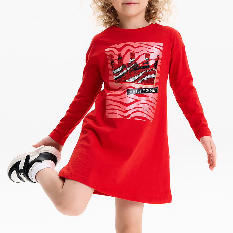 Состав: 100%хлопокОписание: Платье для девочки Pelican. Сарафан свободного объёма, силуэт трапеция. Glossy rubber принт с розовым металликом и золотым глиттером. Корона из переворачивающихся пайеток. В составе ткани качественный 100% хлопок, поэтому изделие хорошо дышит, мягкое и легкое, долго сохраняет форму даже после множества стирок, эластичное и износостойкое, практичное для регулярного применения. Материал приятный для соприкосновения с кожей. Красивая нарядная детская одежда для девочек представлена в популярном цвете: красный. В широкой сетке маленьких, средних и больших размеров: 86, 92, 98, 104, 110 на возраст 2, 3, 4, 5, 6 лет. То есть, подойдет малышам и подросткам. Универсальный тип ростовки для высоких, среднего роста и низких. Классно сочетается с различными предметами гардероба ребёнка. Вы можете подобрать комплект в официальном каталоге селлера. Иногда такой тип одежды называют удлиненной футболкой, так как изделие обладает похожими свойствами. Подходит для кругологодичного применения: летом, зимой, весной, осенью (демисезон и в межсезонье). Одинаково практично для повседневной носки, в детский садик и школу, в домашних условиях, для путешествий и туризма, во время активных игр, прогулок с друзьями и родителями, для хобби и танцев. В таком ты понимаешь - это твое, это топ! Можно подарить дочери и внучке на праздник День рождения, 8 марта, Новый год и Рождество. Ребёнок будет в восторге от популярной молодежной вещи!