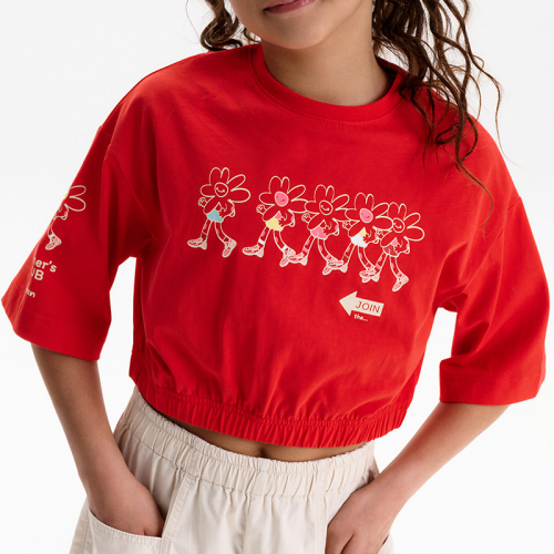 Состав: 100%хлопокОписание: Укороченная футболка (кроп-топ) для девочки. Модель длиной до талии, выполнена из мягкого хлопкового трикотажа. Свободный прямой крой и спущенная линия плеча создают комфортную посадку. Круглая горловина оформлена эластичной рибаной. Широкие короткие рукава доходят до локтя. По низу — удобная резинка, которая помогает красиво держать форму и подчёркивает силуэт. Перевод: присоединяйся к....клубу бегунов!