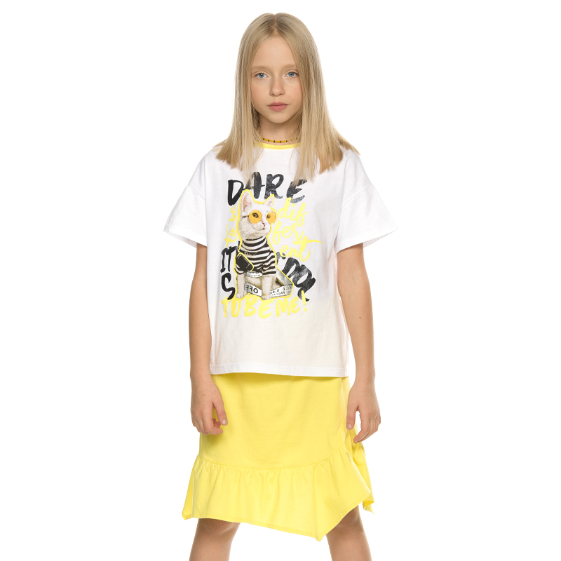 Состав: верх: 100%хлопок, низ: 100%хлопокОписание: Комплект для девочек футболка и юбка. Футболка актуального мягкого оверсайз силуэта со спущенным плечом. Фотопринт и текстовый неоНовый принт с серебряным металликом и глиттером, перевод Осмелься быть другой. Это круто быть мной.. Юбка Новинка. Умеренный объем, по низу юбки пришит фигурный волан. Пояс на комфортной внутренней резинке.