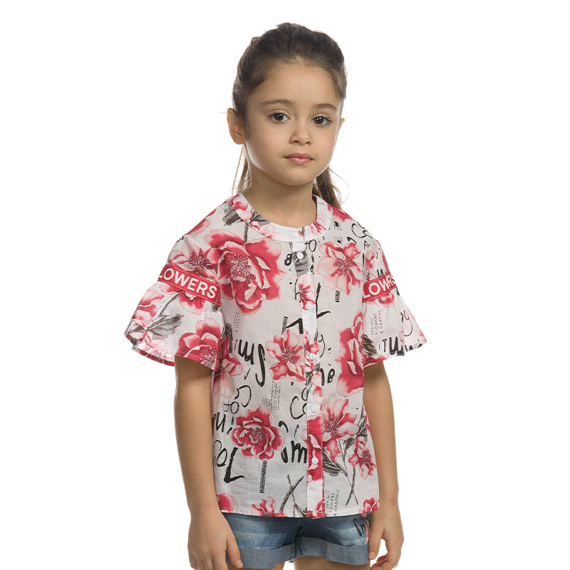 Состав: 100%хлопокОписание: Рубашка для девочек. Блузка из тонкого хлопка с центральной застежкой на 6 пуговиц. Силуэт прямой, свободный. Плавная покатая линия плеча переходит в рукав в рукав с притачным широким воланом. По шву притачивания рюши нашита принтованная репсовая тесьма, перевод "Цветы/дизайн". Мягкий принт по всей поверхности изделия. Удобная, комфортная, легкая, дышащая блузка!
