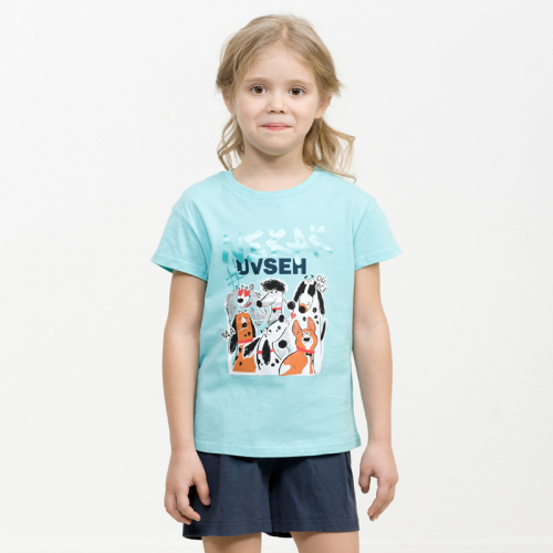 Состав: верх: 100%хлопок, низ: 100%хлопокОписание: Комплект для девочек футболка и шорты. Футболка силуэта оверсайз. Rubber принт собаки стикерпак с обилием серебряного и бирюзового металликов. Шорты свободного силуэта с защипами спереди и регулировкой объема шнуром.
