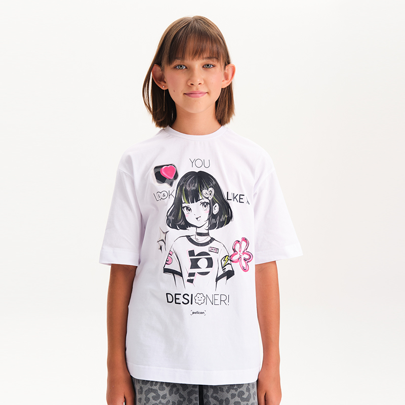 Состав: 100%хлопокОписание: Стильная и удобная белая футболка для девочки умеренного объема. Выполнена из мягкого трикотажа, хорошо тянется, дышит и комфортно сидит весь день. На груди — модный принт с яркими акцентами. Перевод: Ты выглядишь как дизайнер Футболка отлично сочетается с джинсами, юбками и шортами. Подойдёт для школы, прогулок, мероприятий и просто хорошего настроения. Не забывайте о выборе правильного размера. Используйте таблицу размеров на фотографии, чтобы выбрать подходящий вариант. Обратите внимание, что цвет товара на экране вашего устройства может отличаться от реального.