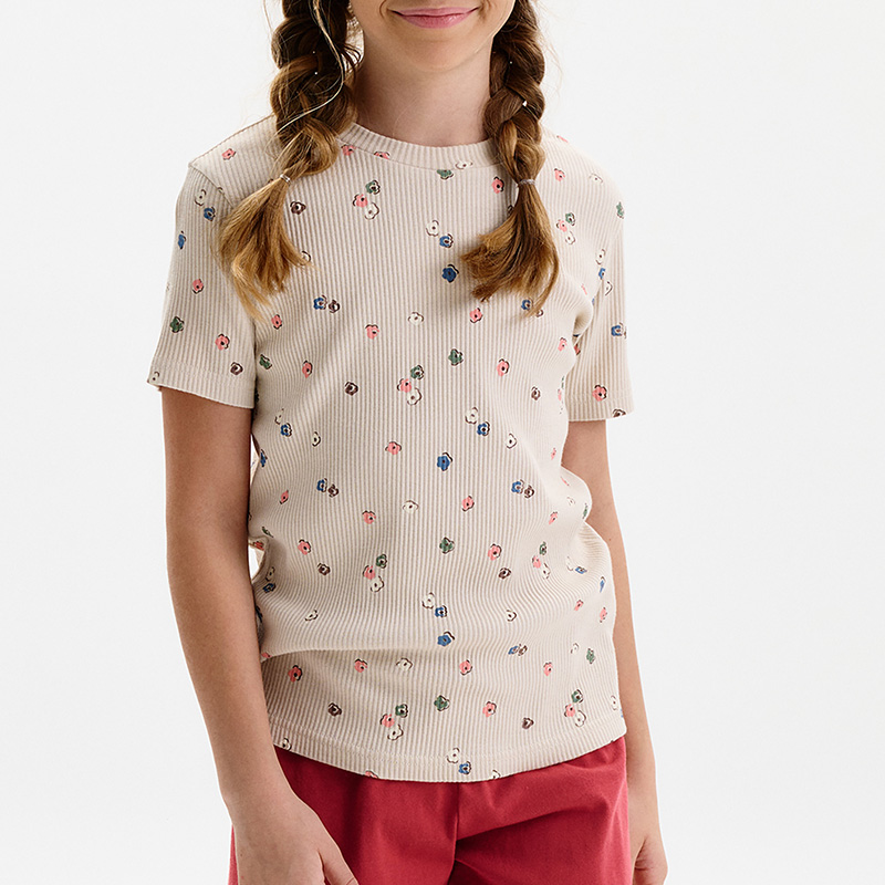 Состав: 50%хлопок 47%вискоза 3%эластанОписание: Очаровательная футболка для девочки из трикотажа кашкорсе — мягкая, эластичная и приятная к телу. Ткань в рубчик отлично тянется, сохраняет форму и обеспечивает комфорт на весь день. Модель умеренного объёма — не обтягивает, но и не смотрится слишком свободной. Легко комбинируется с юбками, шортами, сарафанами и джинсами. Декорирована нежным мелким принтом в виде цветочков, который делает образ особенно милым и романтичным. Идеально вписывается в актуальный "деревенский" (cottagecore) стиль — модное направление, вдохновлённое природой, простотой и уютом. Не забывайте о выборе правильного размера. Используйте таблицу размеров на фотографии, чтобы выбрать подходящий вариант. Обратите внимание, что цвет товара на экране вашего устройства может отличаться от реального.