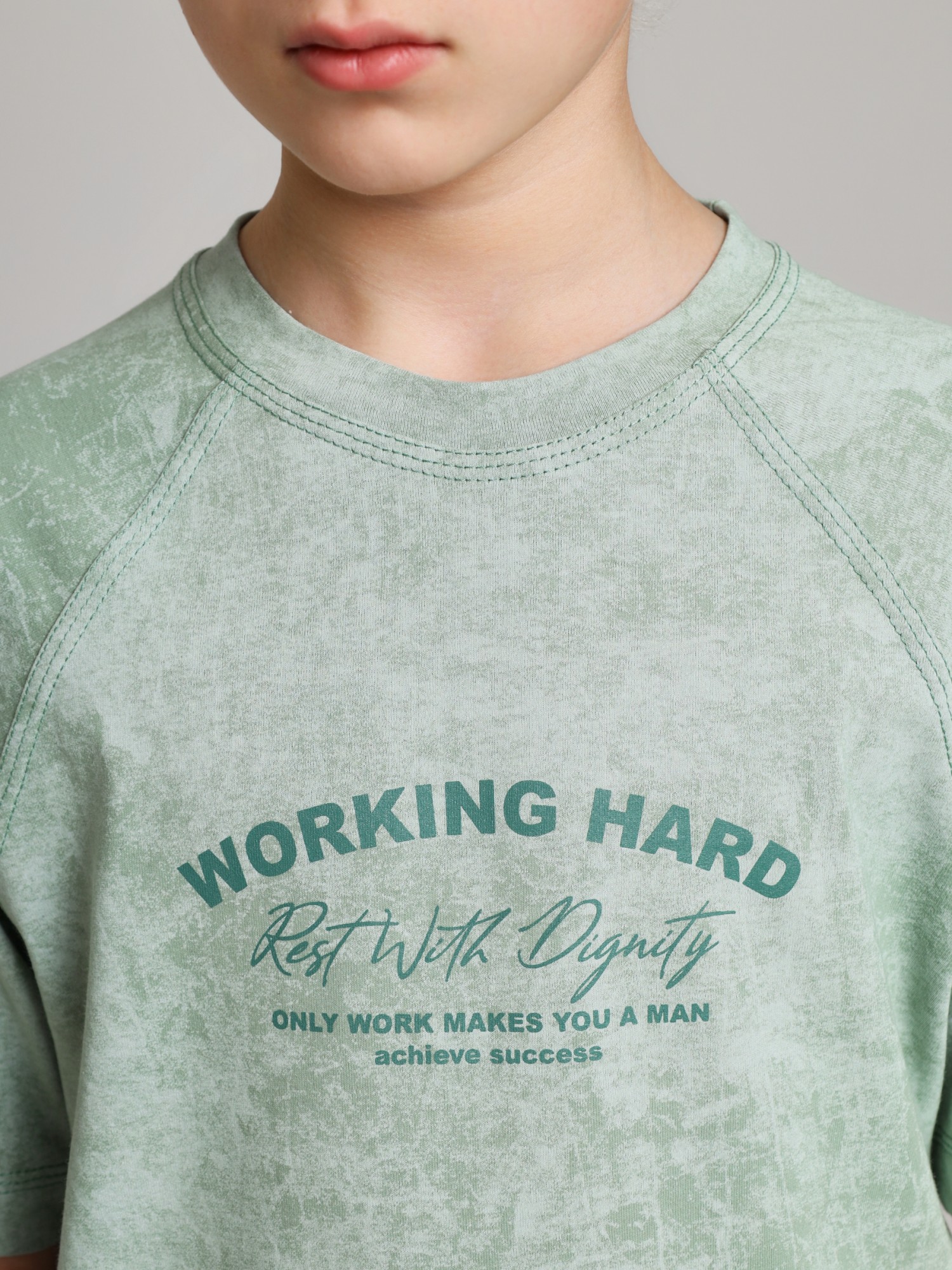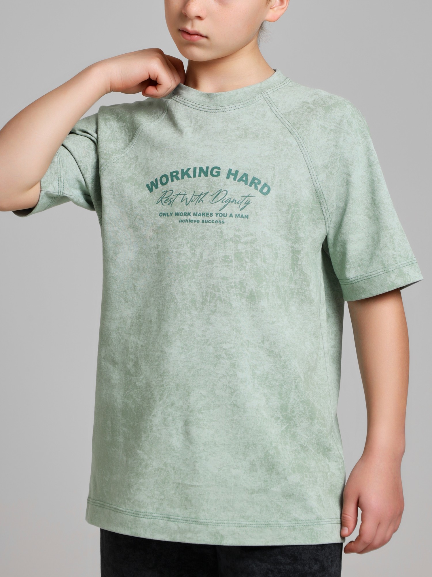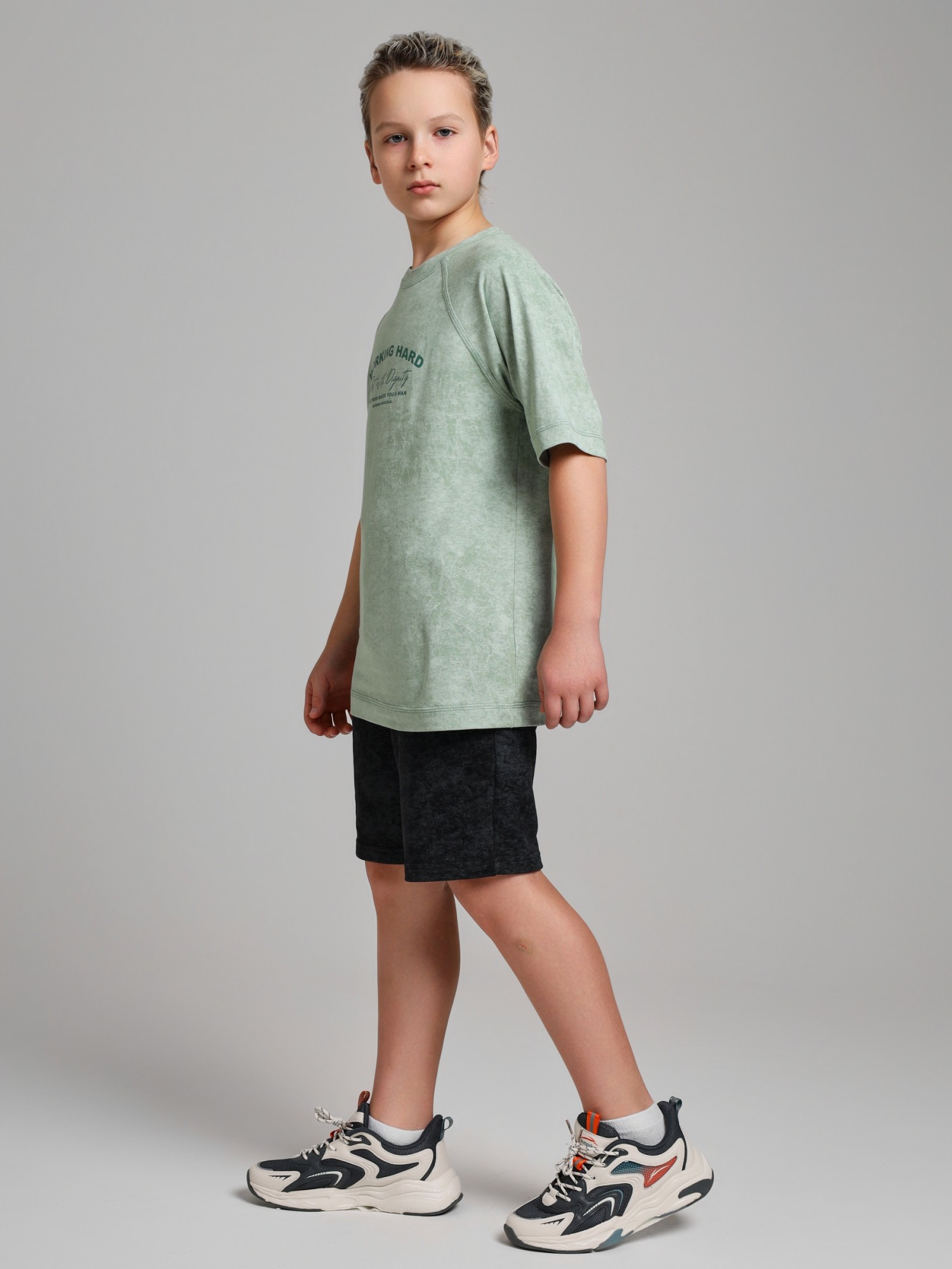 Футболка для мальчика из трикотажного полотна "кулирка-варенка", с короткими рукавами покроя "реглан", горловиной овальной формы, обработанной втачной планкой, и принтом в центре детали переда, выполненным в технике шелкографии. По швам реглана и горловине настрочены отделочные строчки.