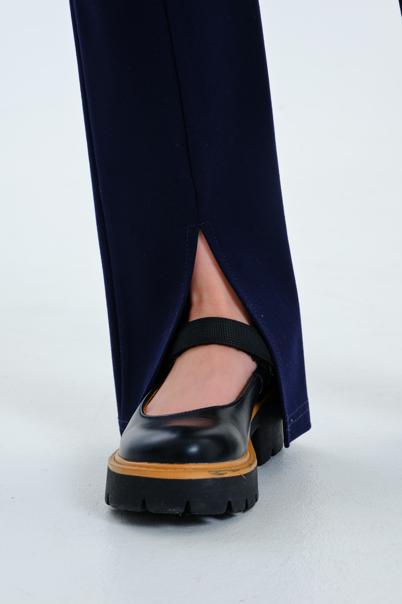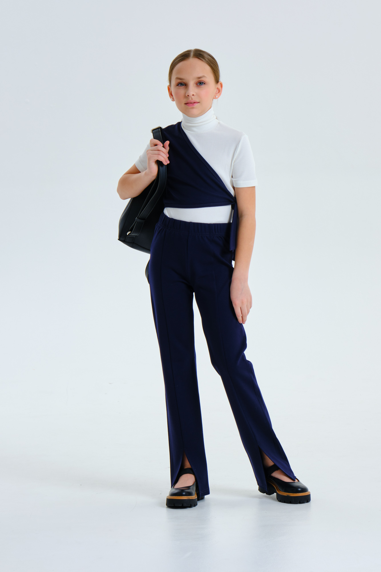 Брюки прямого кроя с разрезами спереди из плотного трикотажного материала, который обладает высокой износостойкостью, практически не мнется, быстро сохнет и не закатывается.