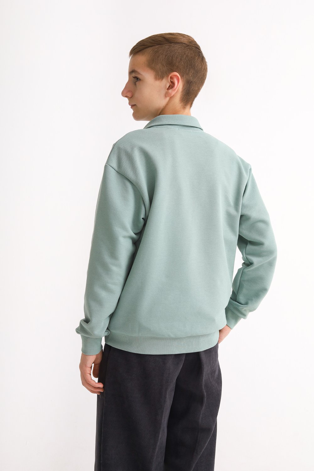 Свитшот умеренного объема. Воротничок-поло с застежкой на кнопки. Манжеты из рибаны на рукавах и по низу изделия.