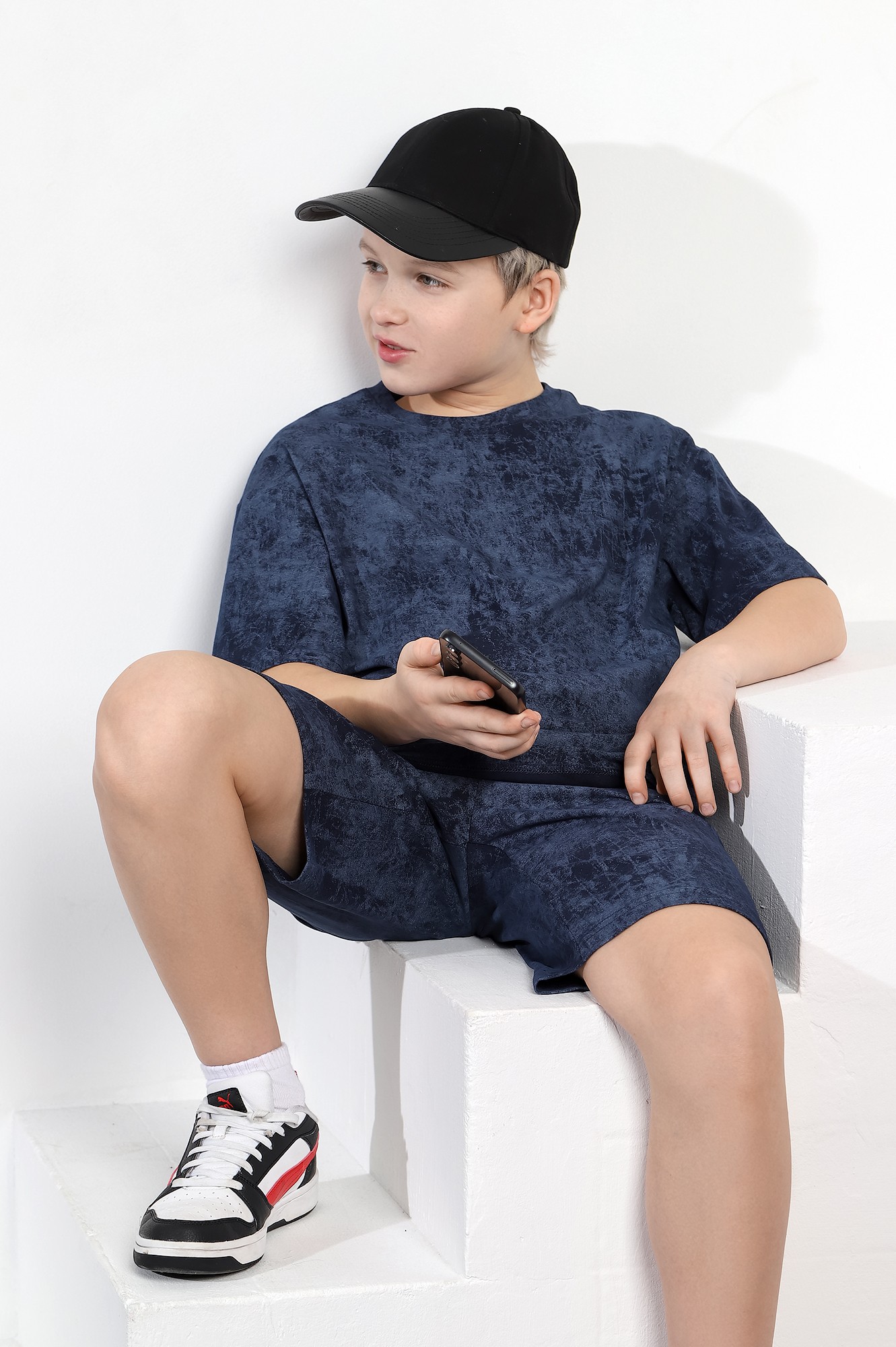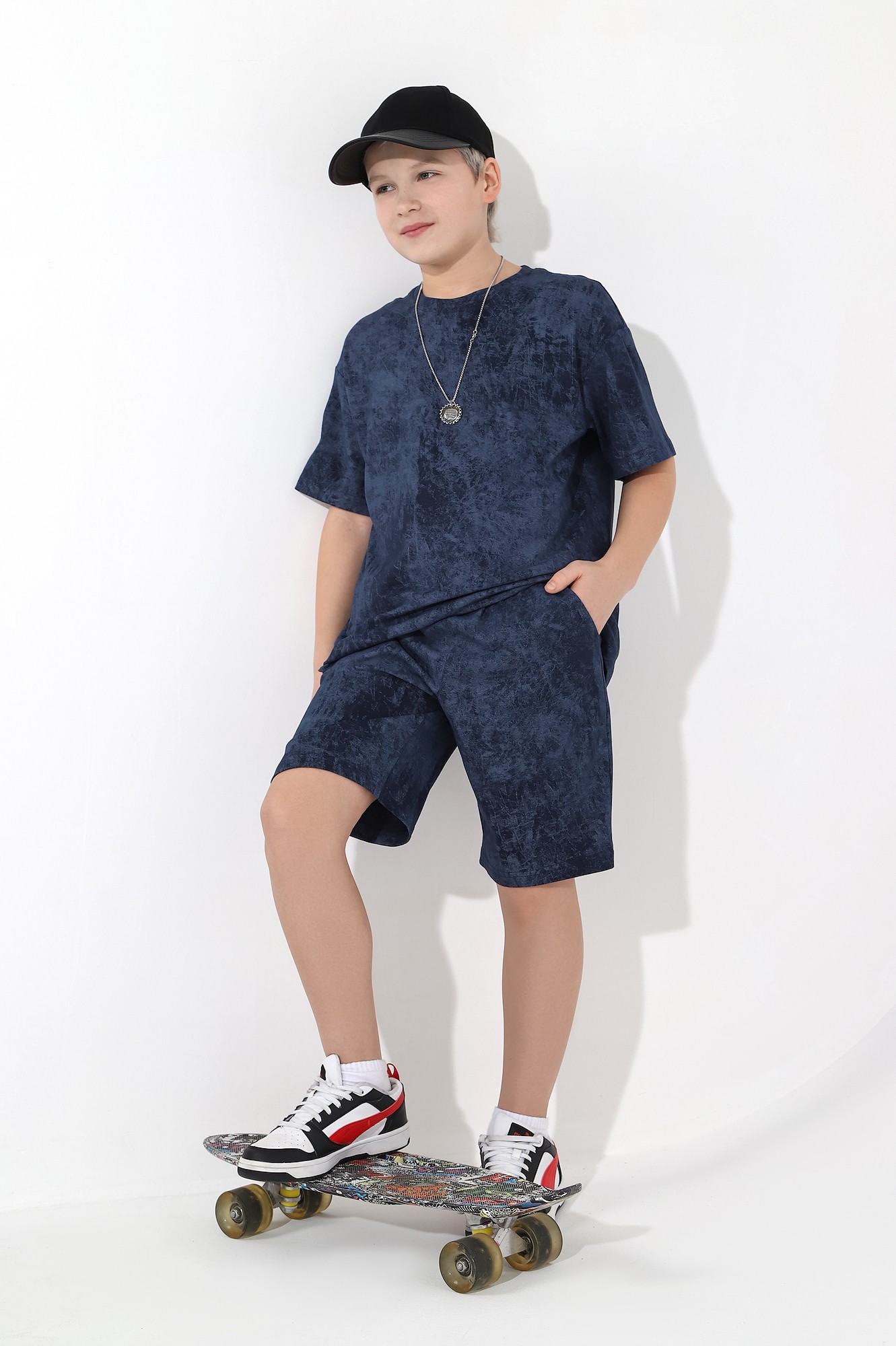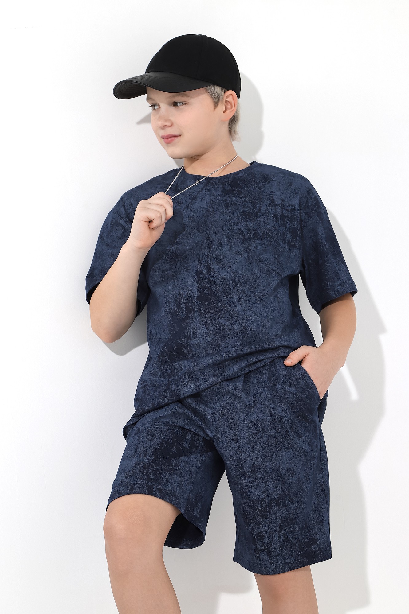 Костюм для мальчика, состоящий из футболки и шорт. Футболка - свободного покроя, короткими втачными рукавами и горловиной овальной формы, обработанной втачной планкой. По шву втачивания планки настрочена двойная отделочная строчка. Шорты - удлиненные, с карманами в боковых швах, на притачном поясе с эластичной тесьмой внутри.
