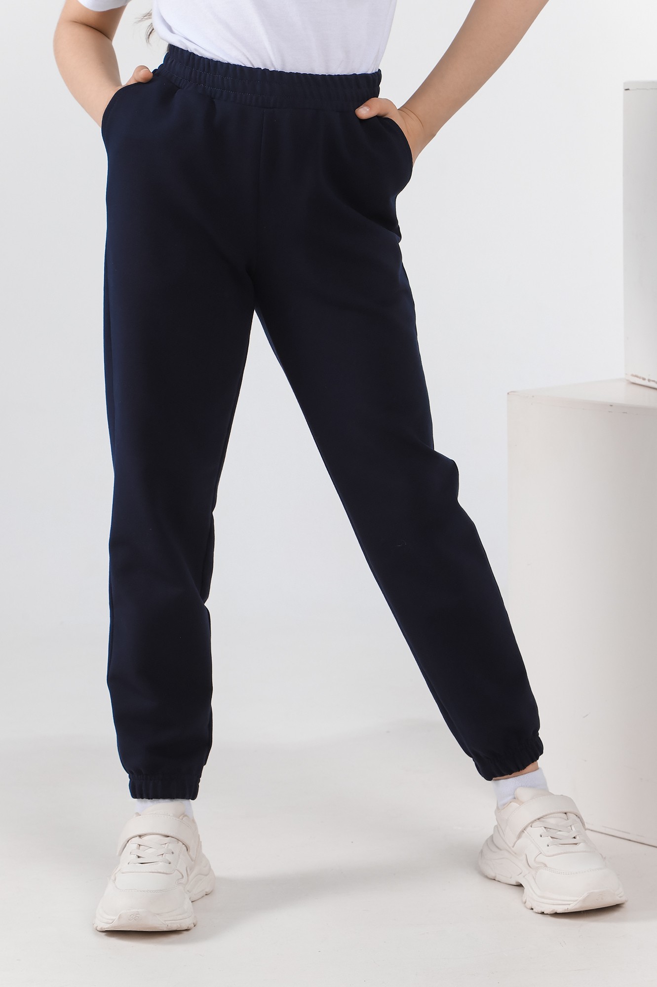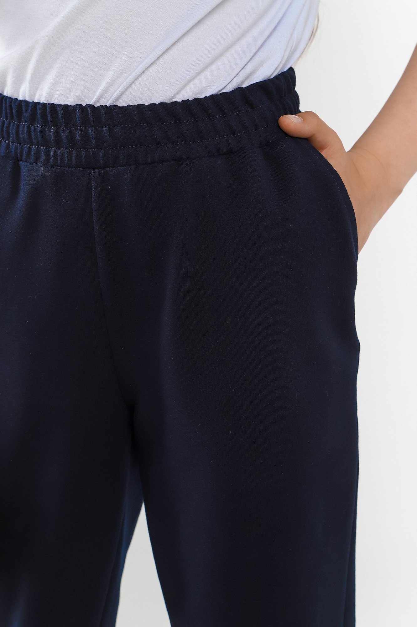 Базовые брюки из футера с лайкрой для девочки. Модель с боковыми карманами, на притачном поясе с отстроченной эластичной тесьмой и внутренним шнуром для регулировки плотности посадки на талии. Низ брючин с эластичной тесьмой.