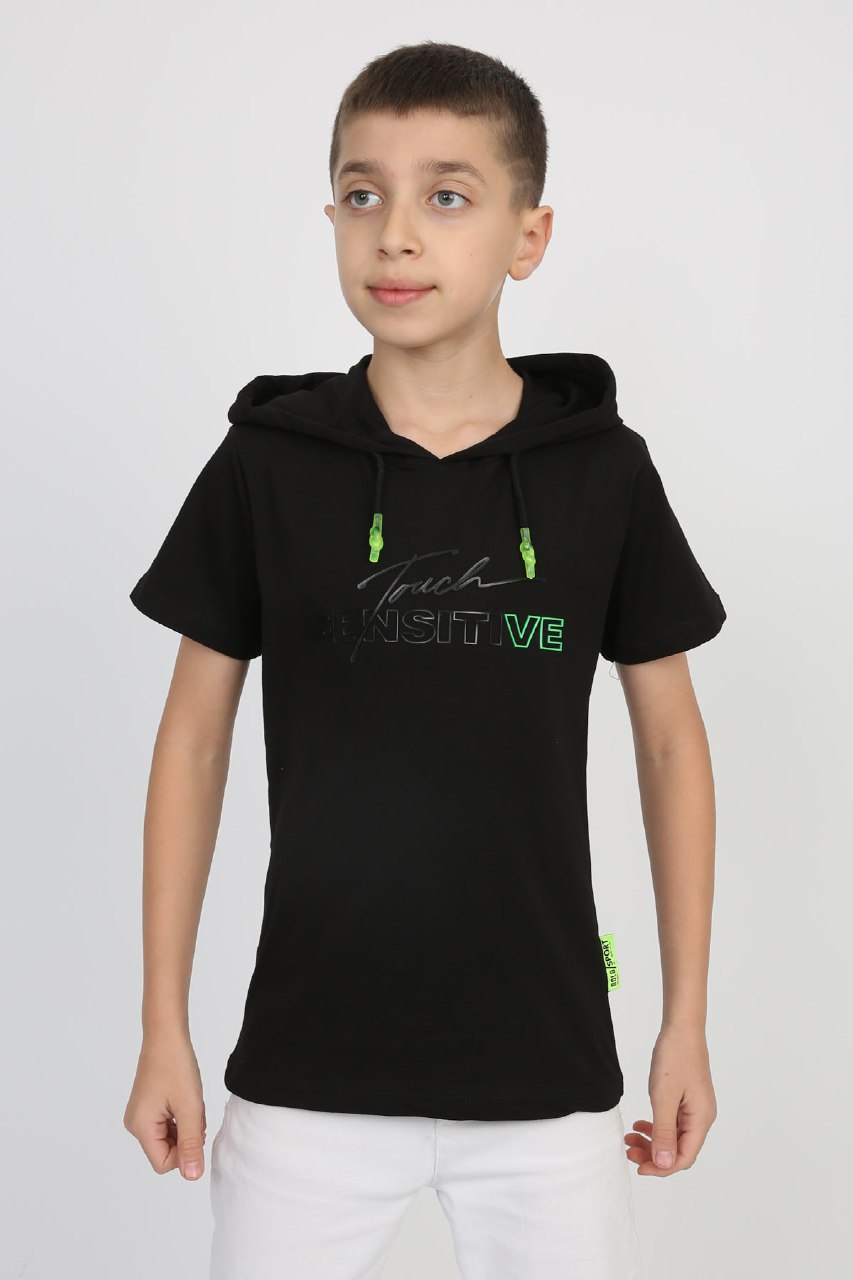 Стильная футболка для мальчика капюшоном.  Дополнена принтом. В размер. Пошив очень хороший.