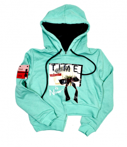 Стильный свитшот для девочки. Низ ассимметричный, по спинке тоже. Капюшон на подкладе. Дополнен принтом и шевроном. Ткань плотная.  В размер.