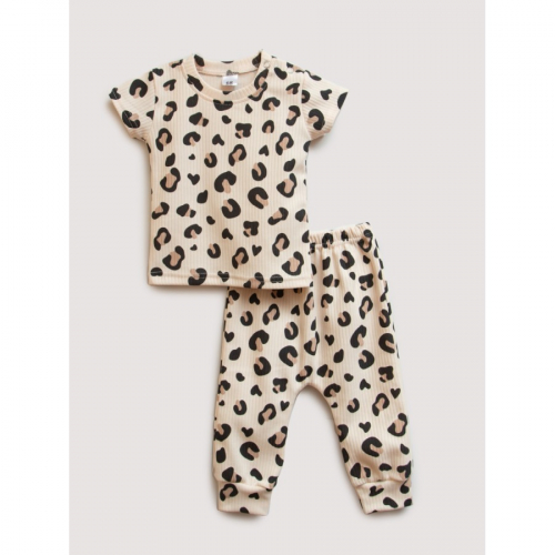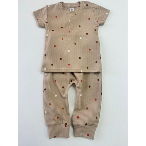 ..81-4 ИГЛ Комплект футболка с кнопками + штанишки из интерлока, "Горох/коричневый".