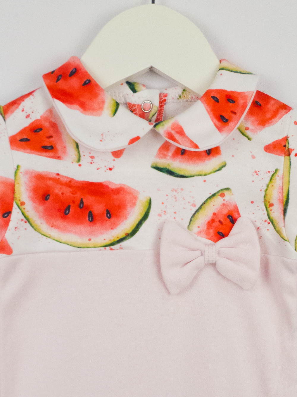 Короткий втачной рукав и воротник, который мягко облегает шею. Кнопки расположены на спине и между ножками для удобного и быстрого одевания. Низ боди обработан мягкой трикотажной лентой для дополнительного комфорта и стиля.
