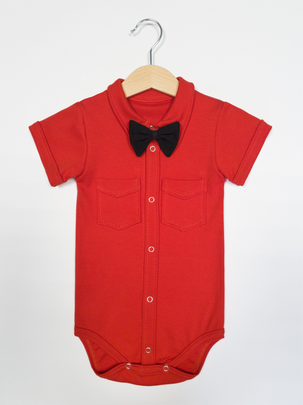 Боди изготовлено из мягкого и приятного на ощупь интерлока. Материал обеспечивает оптимальный воздухообмен и не вызывает раздражения на коже. Дизайн изделия привлекает внимание: на груди расположены накладные карманы, а яркая бабочка  придает образу изысканность.