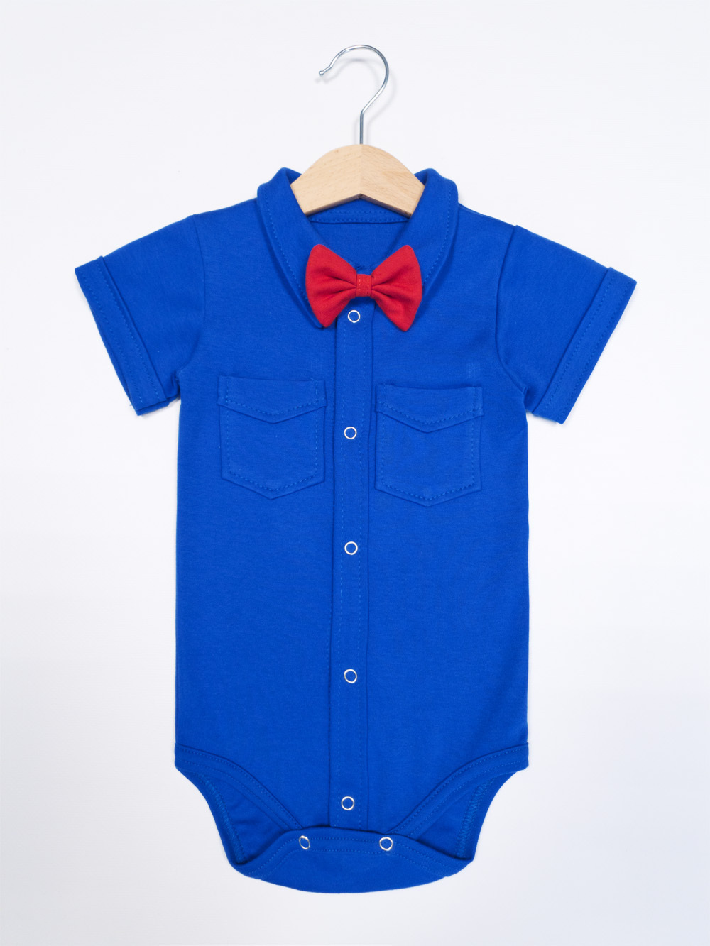 Великолепное боди для маленького принца. Оно имеет короткий втачной рукав, а горловина обработана воротником, что обеспечивает комфорт и защиту нежной кожи малыша. Застежки-кнопочки расположены по всей длине спереди и между ножками, обеспечивая удобство и простоту одевания.