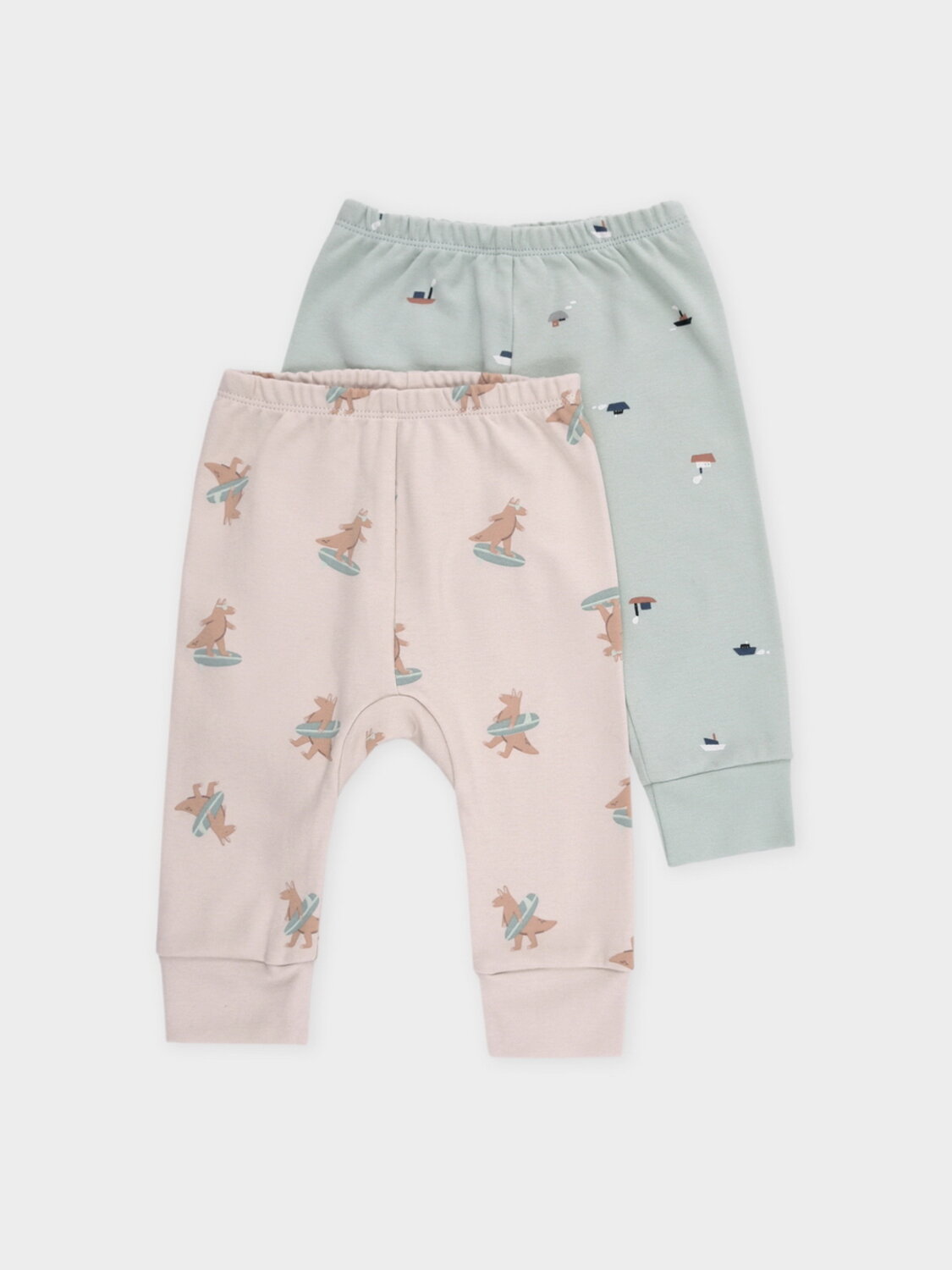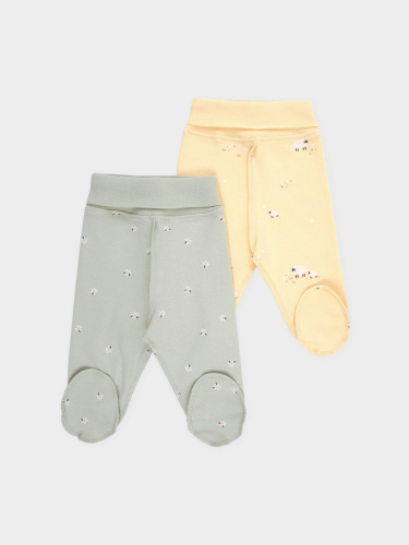 Брюки в упаковке 2 шт для новорождённых из мягкого, эластичного трикотажа, произведенного из натурального хлопка. Пояс на резинке. Оригинальная набивка выполнена из стойких, гипоаллергенных текстильных красителей. Все трикотажные полотна производятся в соответсвии с нормами Швейцарского сертификата ЭкоТекс.