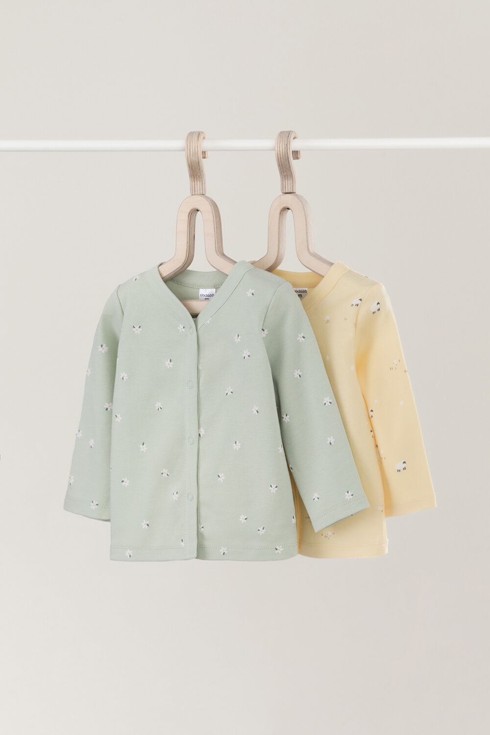 Кофточки в упаковке в количестве 2 штуки для новорожденных из мягкого, эластичного трикотажа, произведенного из натурального хлопка. Изделие застегивается на кнопки. Оригинальная набивка выполнена из стойких, гипоаллергенных текстильных красителей. Все трикотажные полотна производятся в соответсвии с нормами Швейцарского сертификата ЭкоТекс.