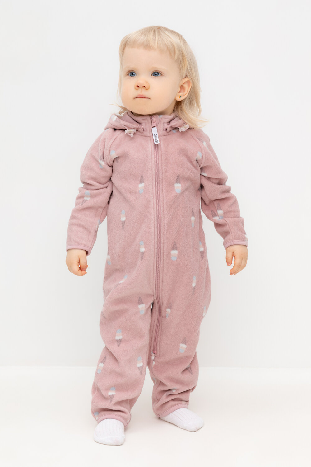 Флисовый комбинезон со съёмным капюшоном для девочки. У изделия высокий воротник и съёмный капюшон на кнопках. Застёгивается на удлинённую молнию. Предусмотрена защита шеи и подбородка. В размерах 40/62 - 48/74 на рукавах и штанинах есть удобные отвороты. Оригинальная набивка выполнена из стойких, гипоаллергенных текстильных красителей. Комбинезон сохраняет цвет и форму после многократных стирок.