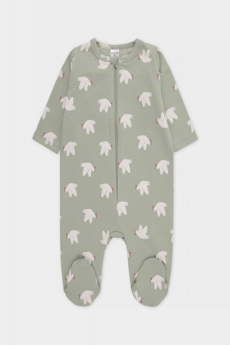 Комбинезон для новорождённых из мягкого, эластичного трикотажа, произведённого из натурального хлопка. Изделие застёгивается на молнию и кнопку. На рукавах мягкие манжеты. Оригинальная набивка выполнена из стойких, гипоаллергенных текстильных красителей. Все трикотажные полотна производятся в соответствии с нормами Швейцарского сертификата ЭкоТекс.