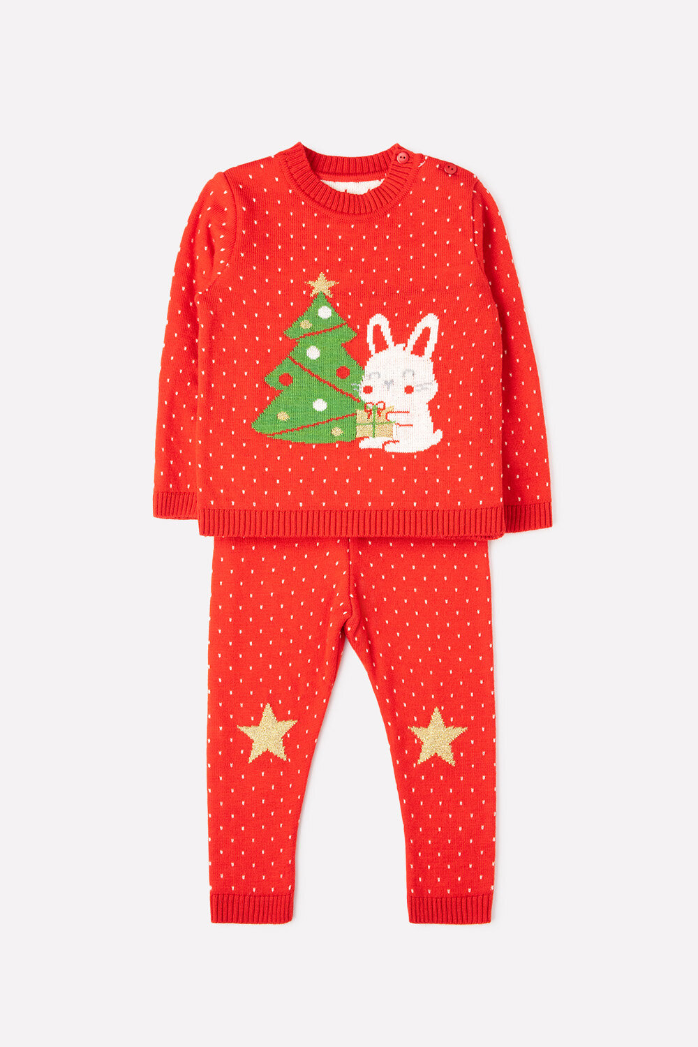 Красный вязаный комплект для девочки: джемпер с круглой горловиной и брюки. Украшен вывязанным узором с изображением зайки и новогодней ёлки. Манжеты и пояс связаны ластиком. На коленях - узор со звёздами.